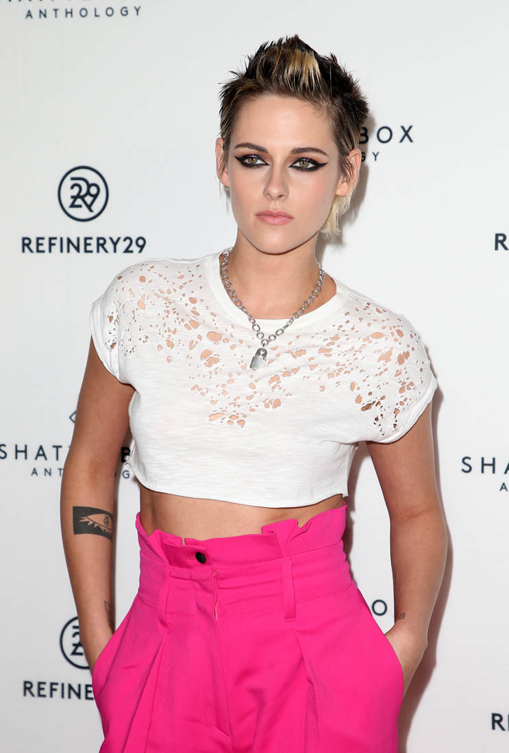 Kristen Stewart’s hot pink pants are not tight. They’re high-waisted, wide-legged, but she is wearing them with a tight crop-top, if you’re looking for some 80s flavour.