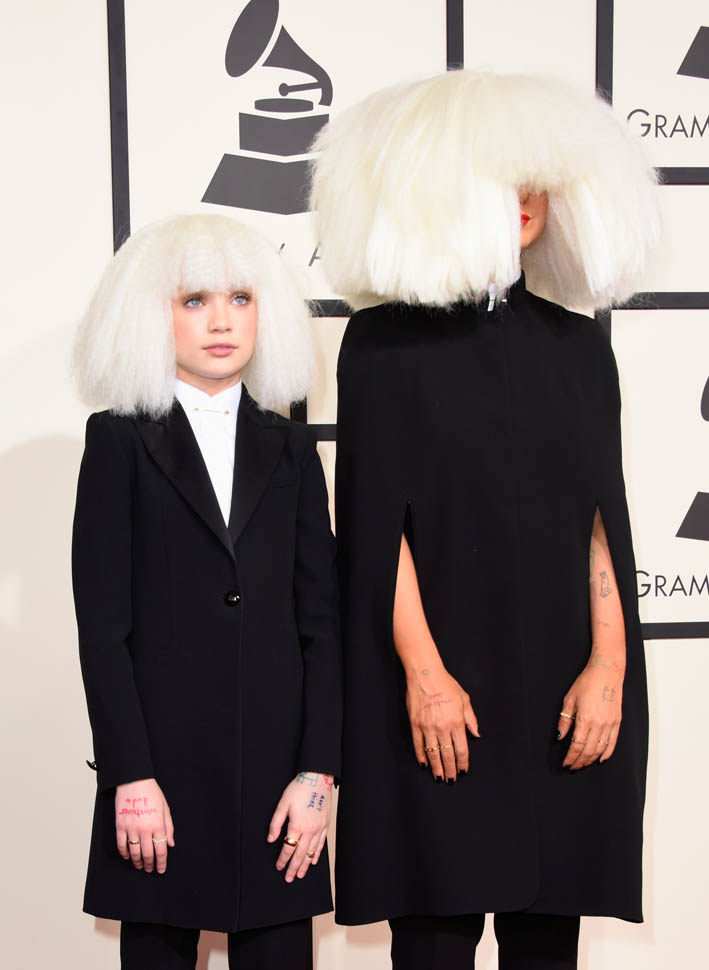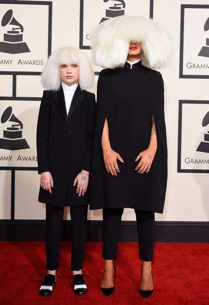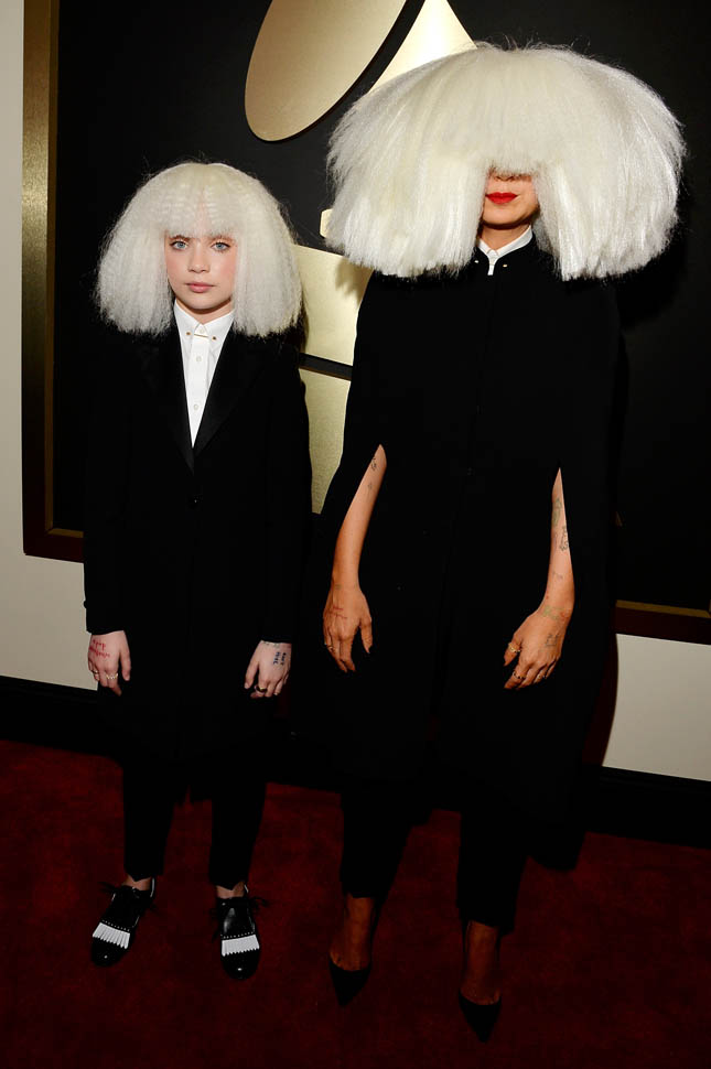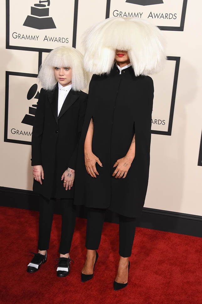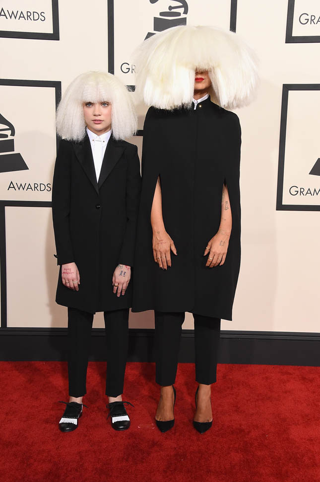 Sia’s red carpet look, however, is totally my jam. It’s the overall aesthetic, the combination of Sia side by side with Maddie Ziegler – the cape, the long suit jacket, the shoes, the hands arranged exactly, just so. It makes Gaga look like amateur hour, non?