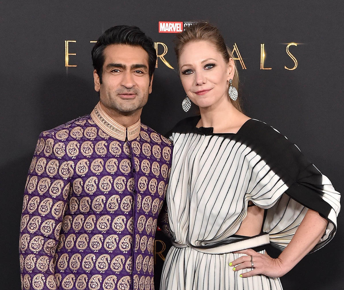 From there, Kumail’s stylist, Jeanne Yang, ended up working with Umar Sayeed Couture, based in Karachi, for this exquisite custom gold and purple paisley-print sherwani. He looks AMAZING. And most importantly it seems like he felt amazing. Being a superhero, in a Marvel movie, represents more than just a paycheque for Kumail. It’s the fulfillment of a personal dream. He also knows that seeing him on screen in this role could represent the beginning of a dream for so many others. On this night, then, his outfit was more than just a photo opportunity. The outfit is a symbol of both hopes realised and hopes that are beginning to take shape.