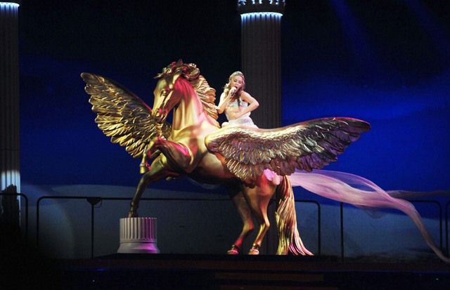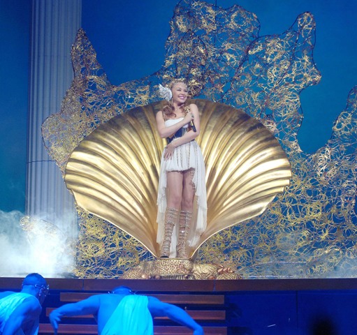 This is what you want from Kylie. This is what her fans demand. And apparently she delivers, kicking off the show accessorised by a large gold shell, like Botticelli Venus styles. Dolce & Gabbana designed the clothes, part of a price tag for the production rumoured to be around $25 million.