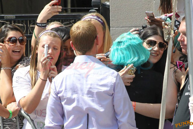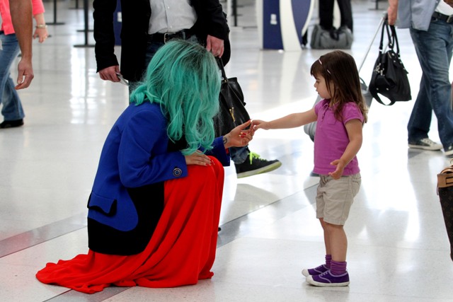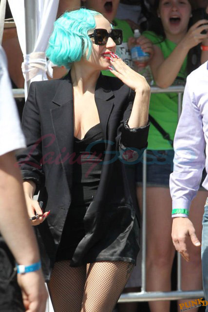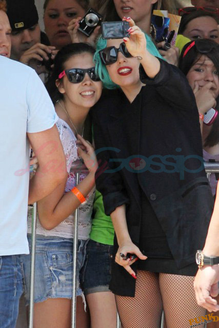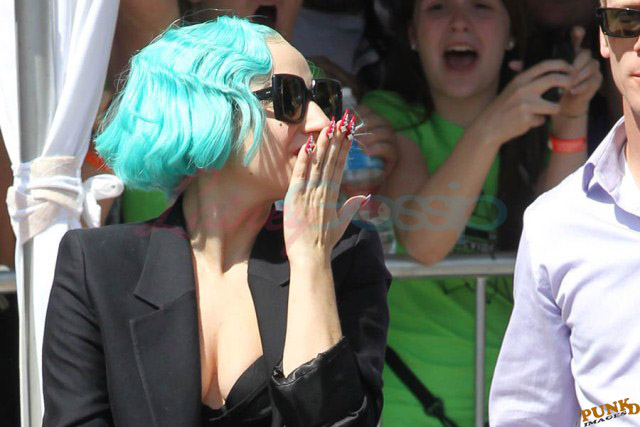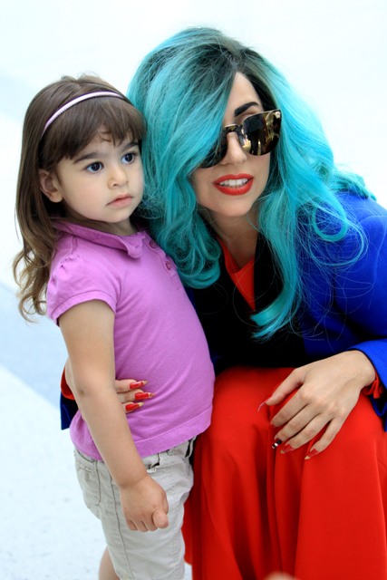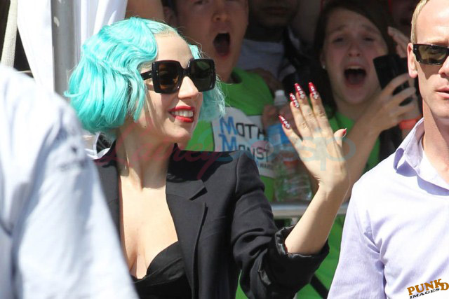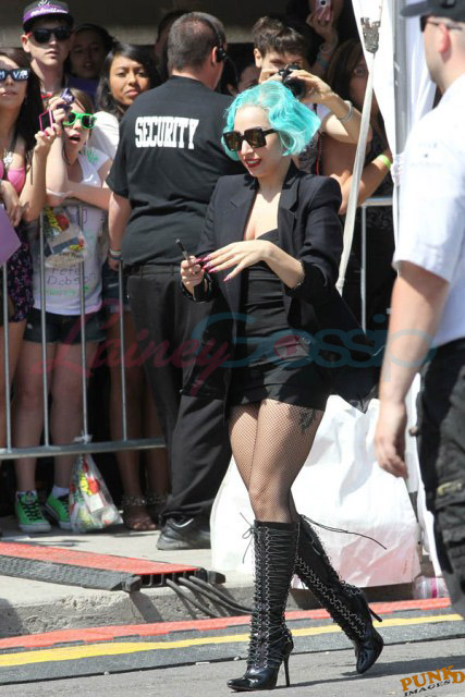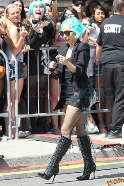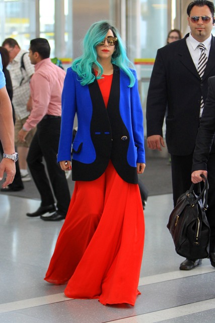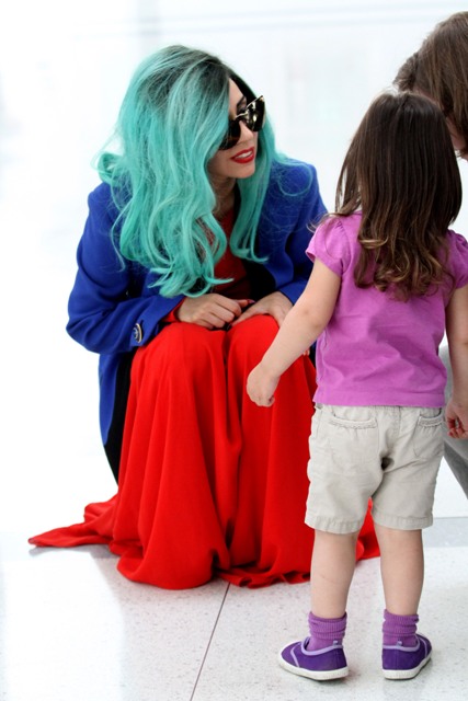 And then there are the shoes. Gaga is my height, about 5’3”. Ben is over 6’1”. So that’s a foot. Of shoe. The outfit reminded me of classic Gianni Versace. She wore the same jacket at the airport today when leaving Toronto but not before hanging out with a kid.