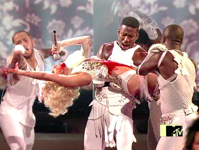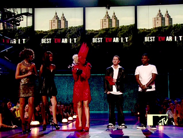 Her next costume was that Queen of Hearts from Hell getup she had on when she went on stage to accept the award for Best New Artist. Loved when she shouted out, “This is for God and for the gays!” while Eminem stood uncomfortably behind, biting his cheek. Is Eminem even relevant anymore? I’d never heard of his song until this show. Maybe he and J. Lo should get together and do a “We’re still here!” album.