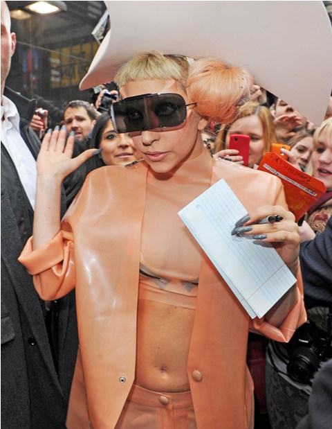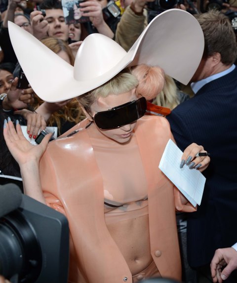 This is Lady Gaga at Good Morning America today arriving in typical crazy ass fashion, wearing a rubber suit, like literally a suit, with nipple tape and, by her standards, a rather ordinary hat.