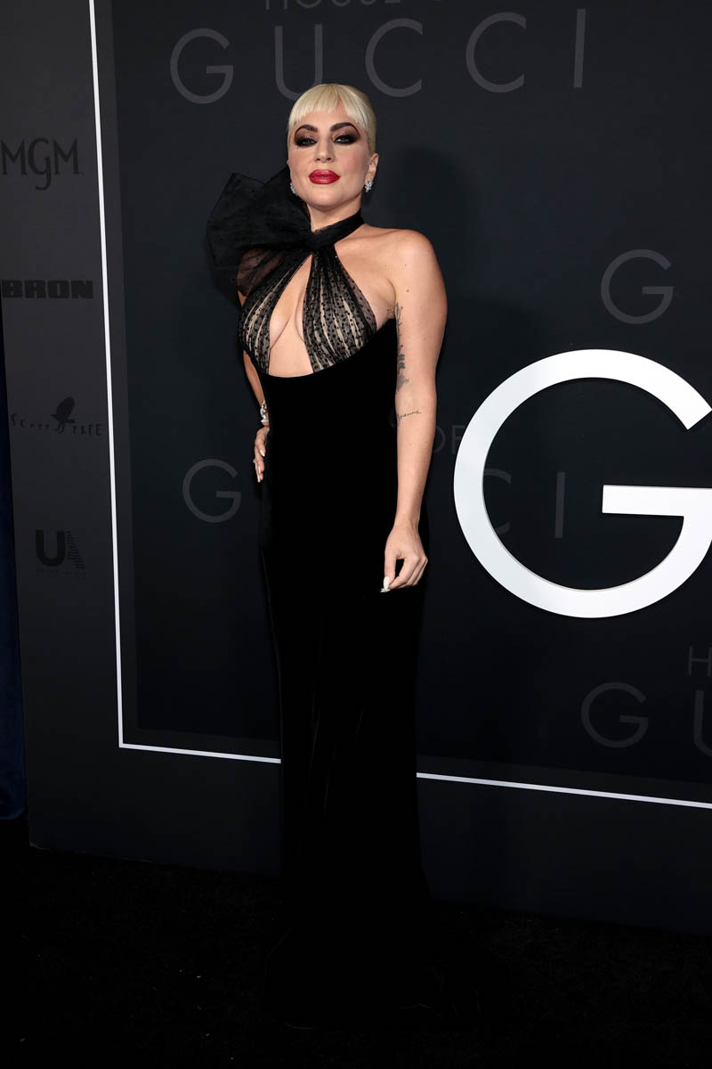 Lady Gaga brought House of Gucci home last night at the New York premiere. As expected, she served full Gaga on the carpet in a black sheer halter Armani Privé dress wide a side-bow and severe hair and makeup, appropriate to the person she’s playing in the film: Patrizia Reggiani. Nobody needs earth tones and pretty, flowing pieces from Gaga on this press tour. And with Armani, Gaga is continuing to serve a mostly Italian wardrobe on promotion – Gucci, Versace, Valentino, Armani, one dramatic look after another. And we’re still a week away from theatrical release and the inevitable award shows. We have a lot of Gaga to go.