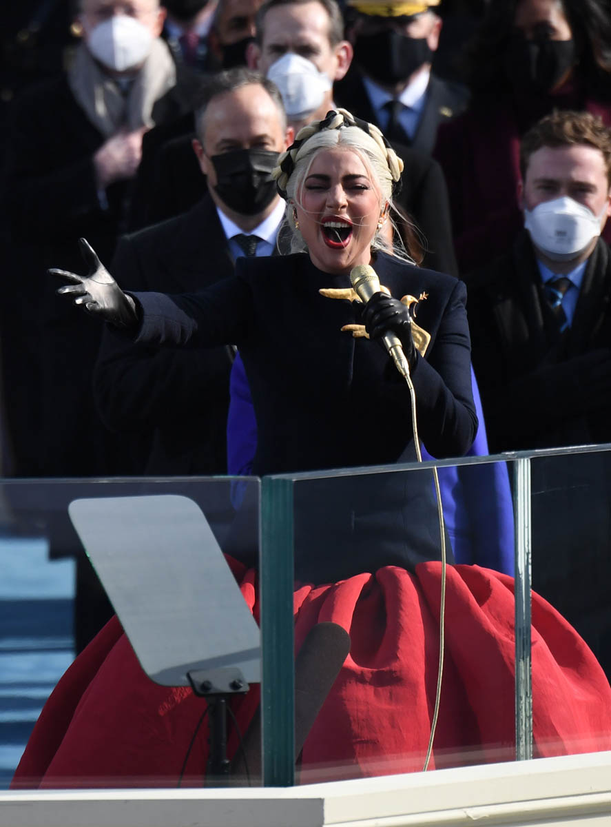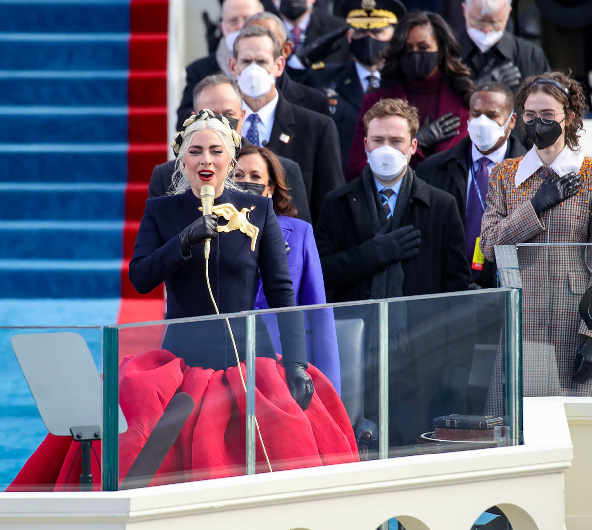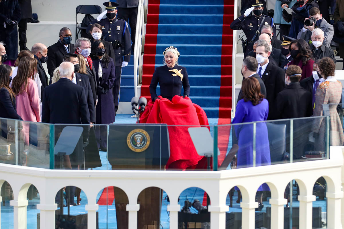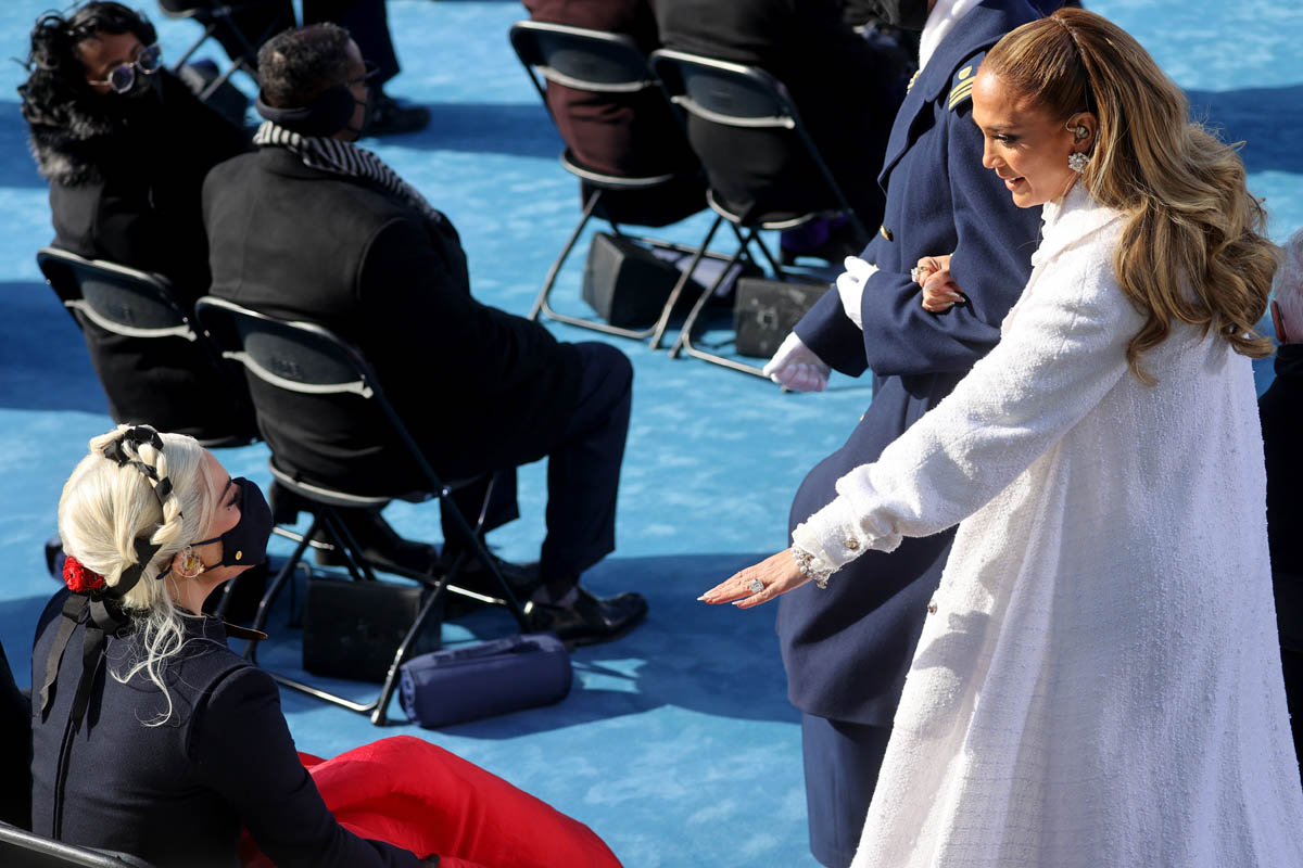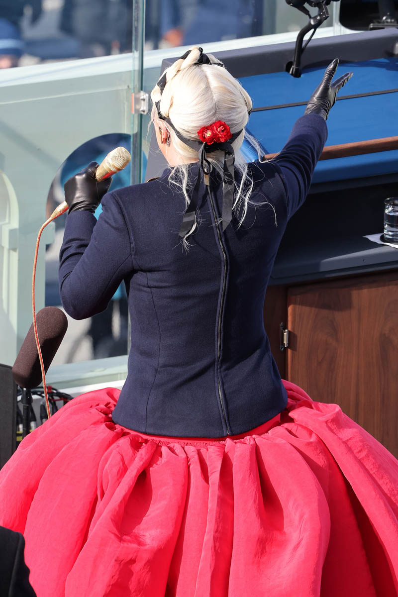 So when Gaga walked out in all her Gaga-ness, with the hair and the billowing skirt and the gigantic dove pinned on her heart, the olive branch in her ears, and when JLo descended the steps in sparkling white, as if to signify a new beginning, I was happy to see it. And happy to hear it, for the most part. I thought Gaga’s version of “The Star Spangled Banner” was beautiful and of course, she put all her theatricality into it with a gold microphone – especially in the moment she turned to the flag during “our flag was still theeeeerrrrrrre”, a part in the song that’s particularly poignant now considering what happened when Trump insurgents attacked the Capitol just two weeks ago: