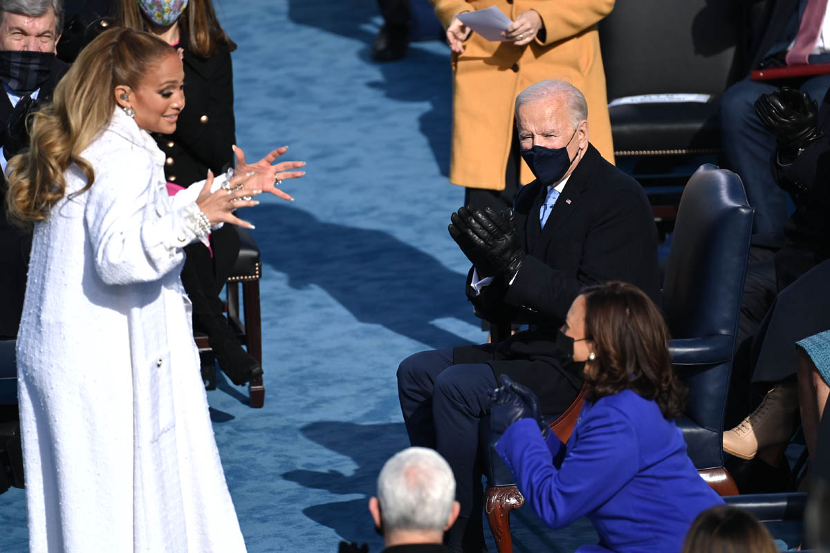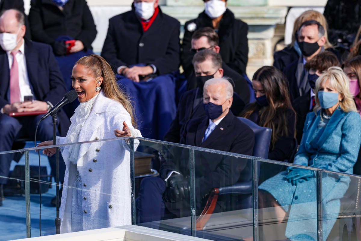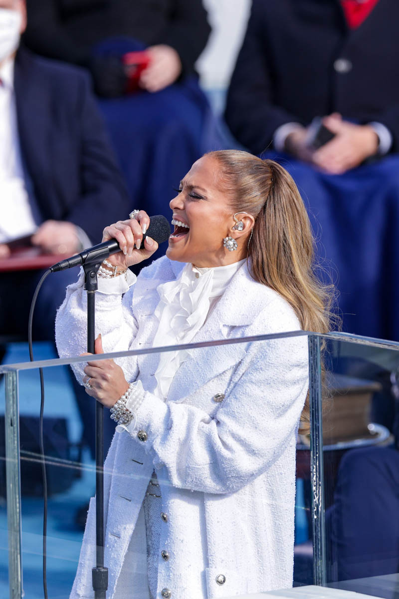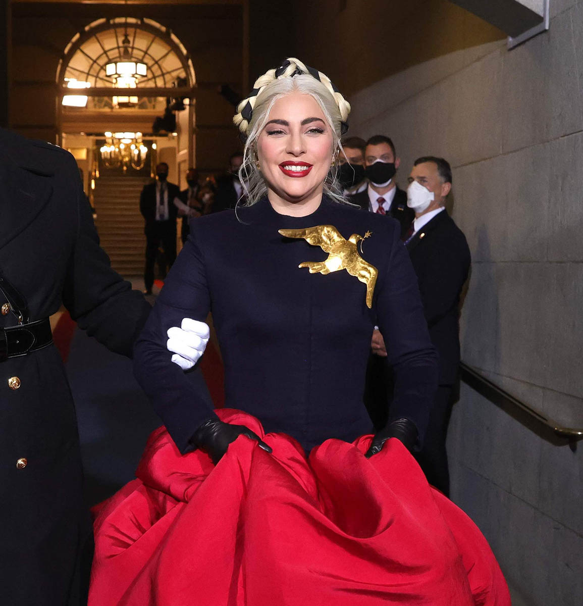 So when Gaga walked out in all her Gaga-ness, with the hair and the billowing skirt and the gigantic dove pinned on her heart, the olive branch in her ears, and when JLo descended the steps in sparkling white, as if to signify a new beginning, I was happy to see it. And happy to hear it, for the most part. I thought Gaga’s version of “The Star Spangled Banner” was beautiful and of course, she put all her theatricality into it with a gold microphone – especially in the moment she turned to the flag during “our flag was still theeeeerrrrrrre”, a part in the song that’s particularly poignant now considering what happened when Trump insurgents attacked the Capitol just two weeks ago: