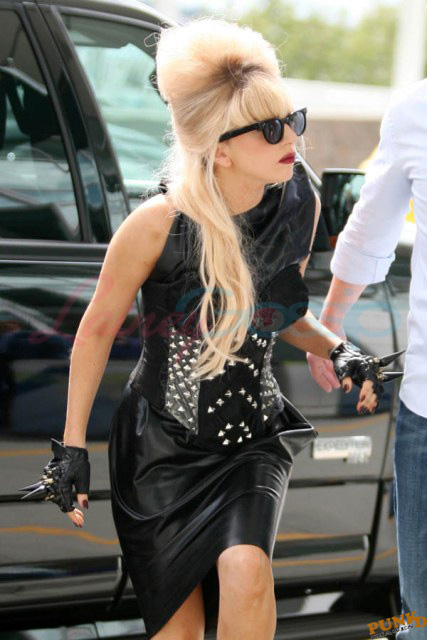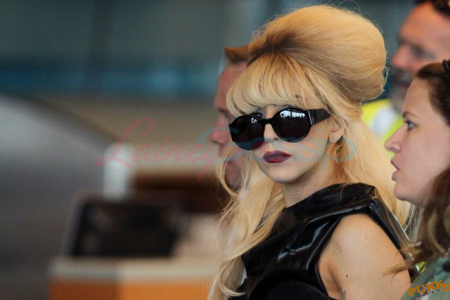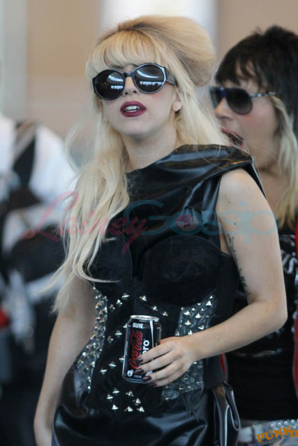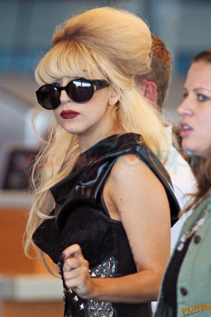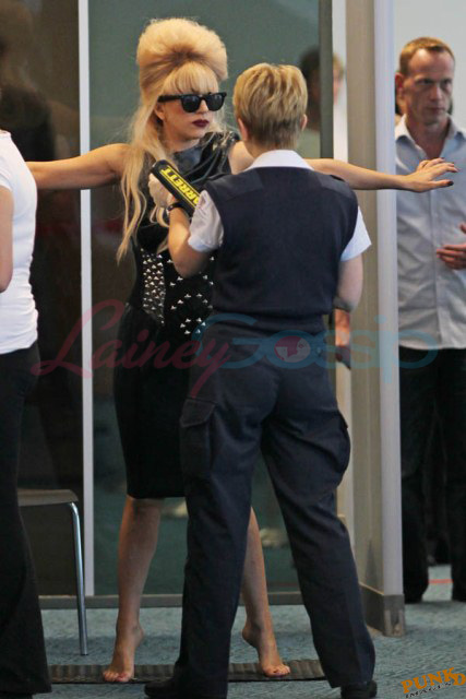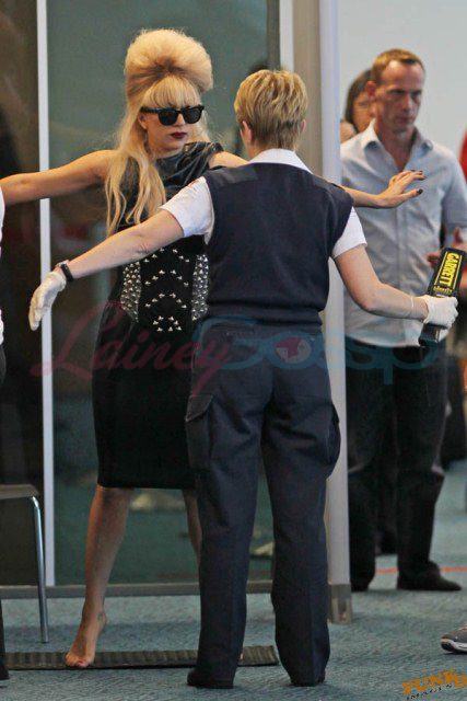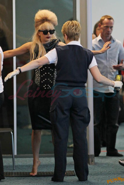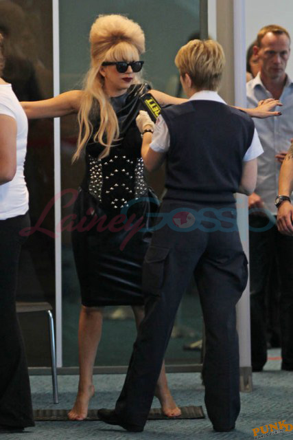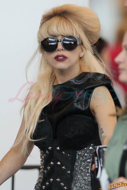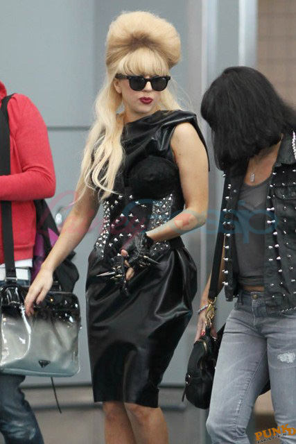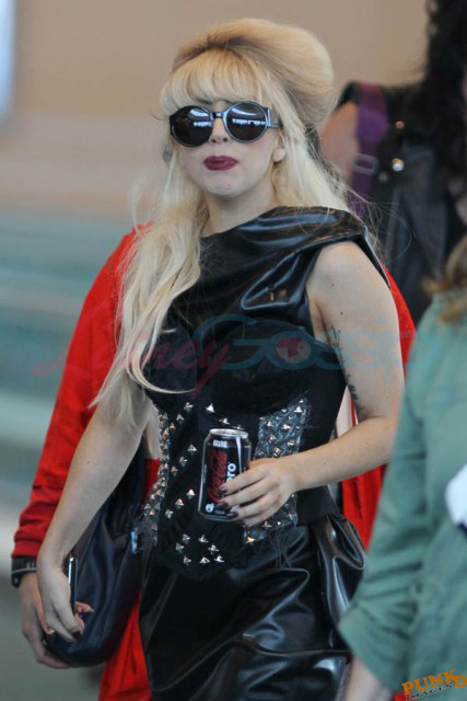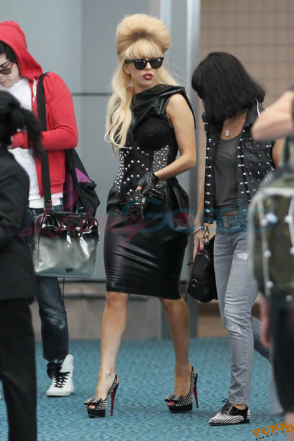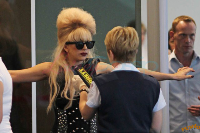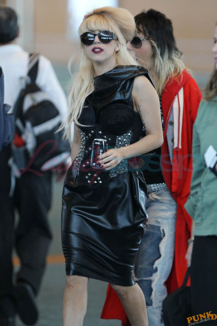As always, committed to her image, Lady Gaga departed Vancouver after two shows this weekend dressed in leather, studs, and rhinestones. Actually rather tame by her standards. Gaga posed with fans before heading to the gate, through security, where her metals had to be further examined. I love these photos so much, standing there on tiptoe loaded up with spikes, it’s amazing in its ridiculousness. And then of course for some reason she changes sunglasses.