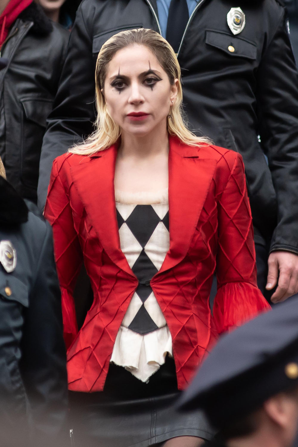 Now, though, we have a clear look at Gaga in character on the set of Joker 2 in New York City over the weekend. On Saturday, she was seen filming in a red and black outfit with a toned-down version of Harlequin-inspired makeup. This whole look calls back to Harley’s aesthetic in the classic Batman: The Animated Series, where the character made her debut in the 1990s (the current look on the VERY good Harley Quinn animated series on HBO Max is a combination of Harley’s classic red and black outfit and the pink and blue scheme introduced by Margot Robbie’s live-action version).