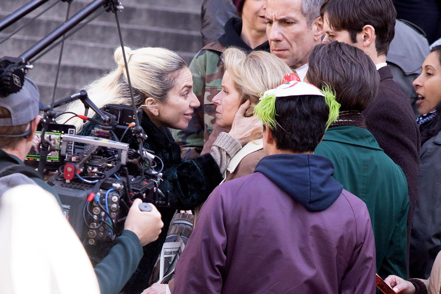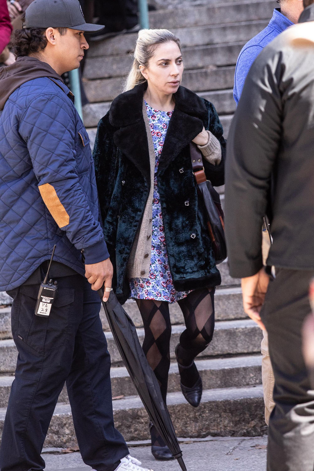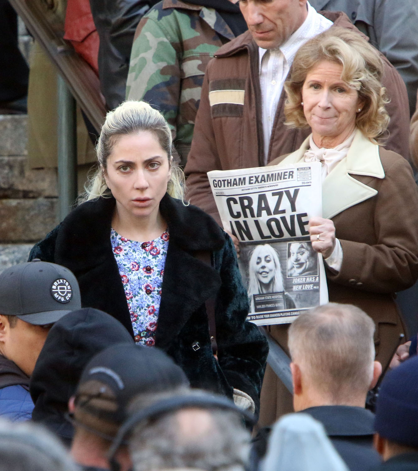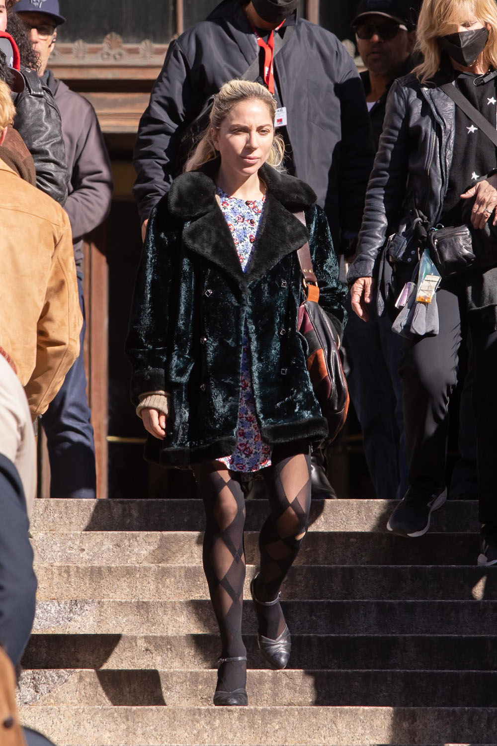 On Sunday, we also got to see Dr. Harleen Quinzel in her everyday clothes. Joker takes place in a 1980s version of Gotham City, and based on Gaga’s costumes, it looks like we’re jumping into the 90s. The dress and tights combo is hitting my early 90s memory of the dELIA*s catalog arriving, full of baby doll dresses. The coat reads vintage, unless that IS crushed velvet, in which case: 90s (though influenced by 70s nostalgia).