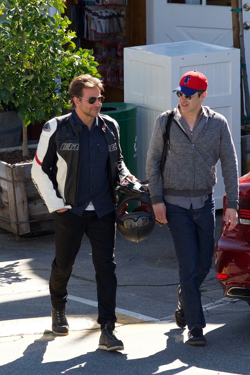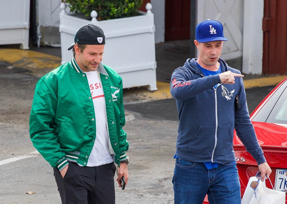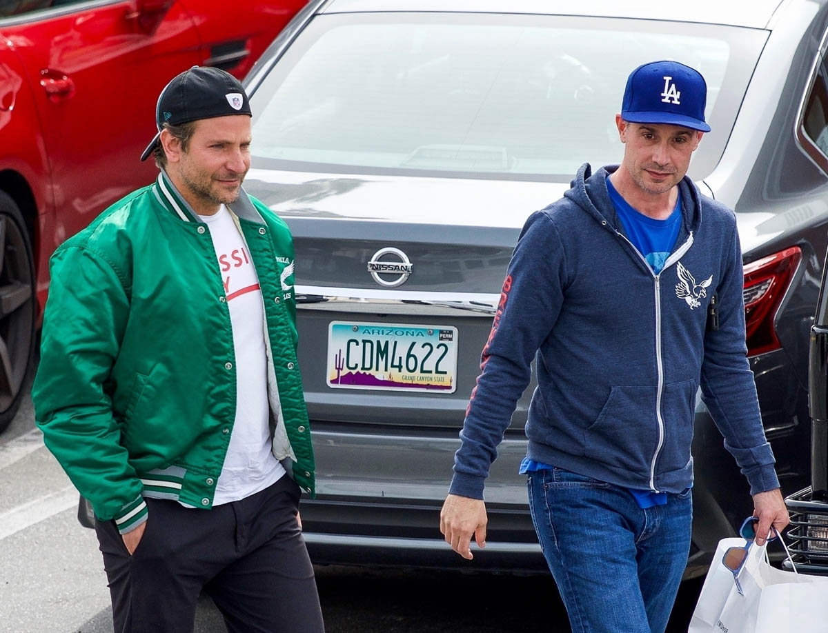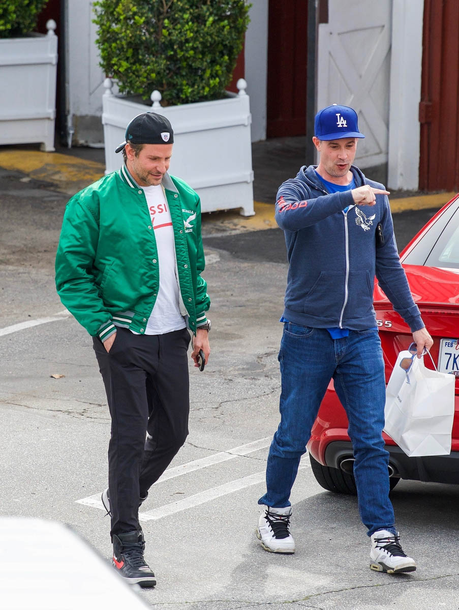 I love when they do this, when they use an old photo to go with the story, like this one about house-hunting, where his hair is clearly the hair he grew out for the movie and not the hair he has now. Here are two sets of photos of Bradley Cooper taken this week and you can see his hair is pretty much what it was like at the Oscars. He was hanging out with Freddie Prinze Jr – that happened the other day – and today he was seen out with another friend. Can we focus on the important matters please?