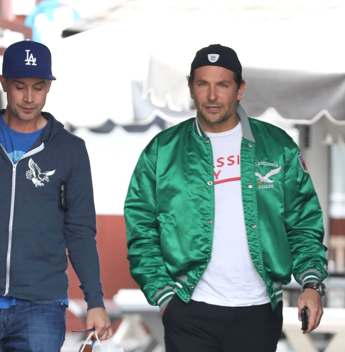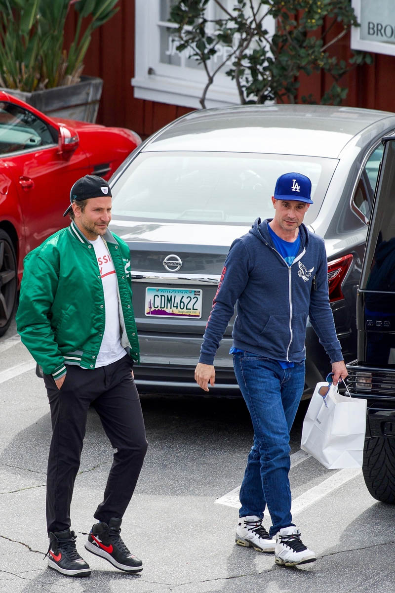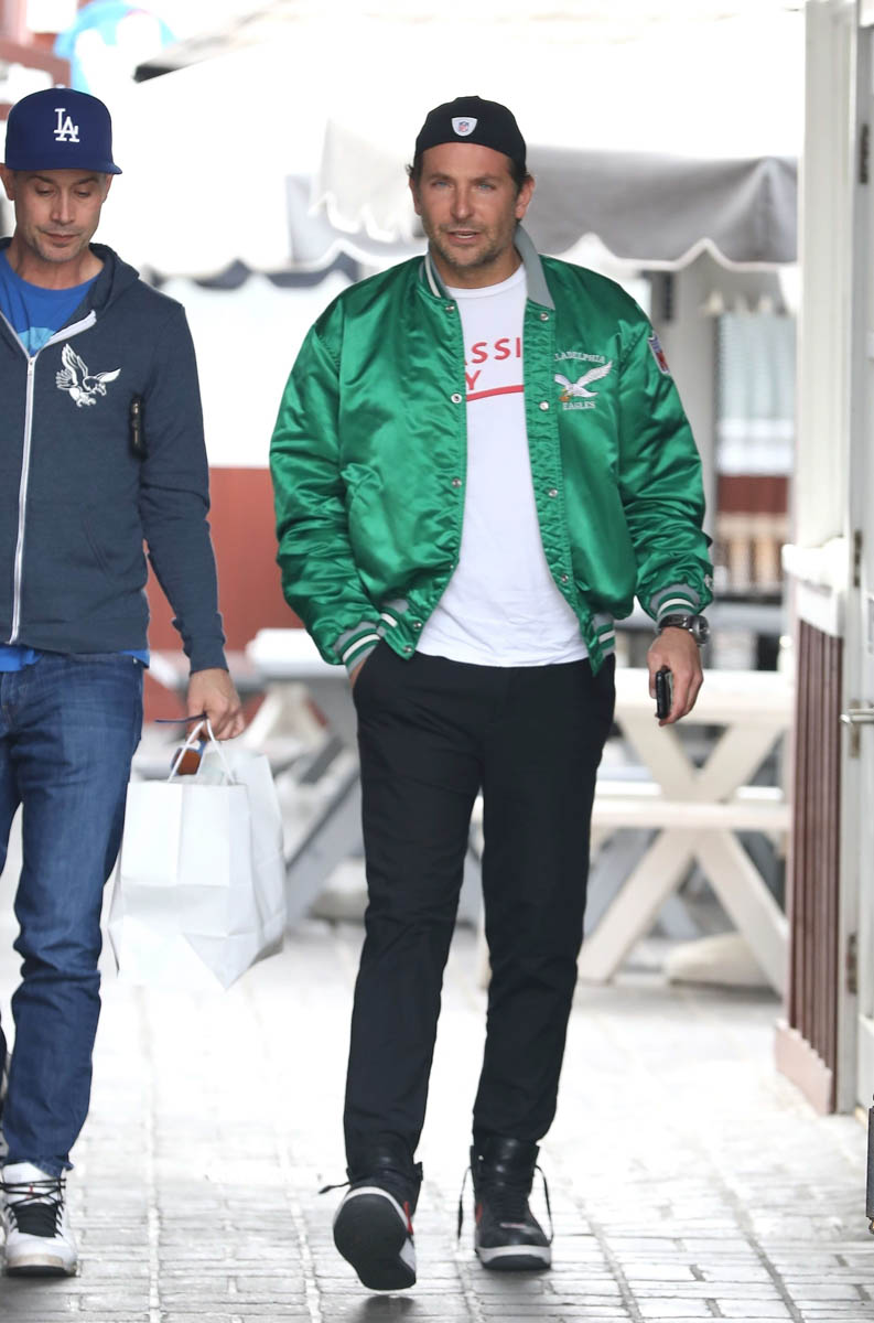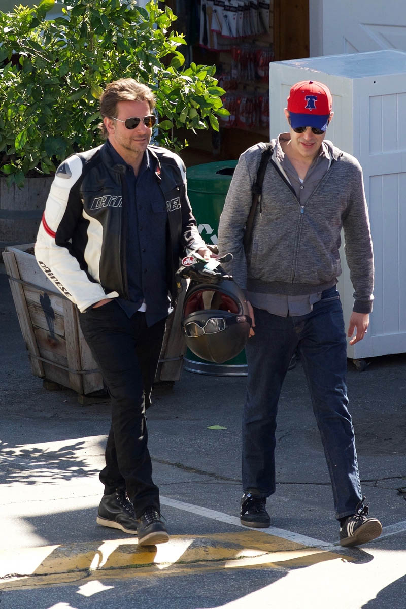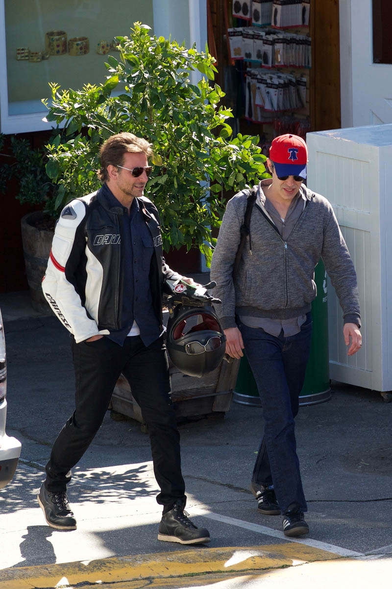 I love when they do this, when they use an old photo to go with the story, like this one about house-hunting, where his hair is clearly the hair he grew out for the movie and not the hair he has now. Here are two sets of photos of Bradley Cooper taken this week and you can see his hair is pretty much what it was like at the Oscars. He was hanging out with Freddie Prinze Jr – that happened the other day – and today he was seen out with another friend. Can we focus on the important matters please?