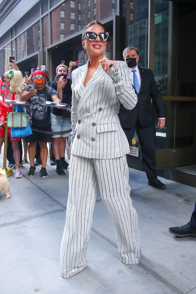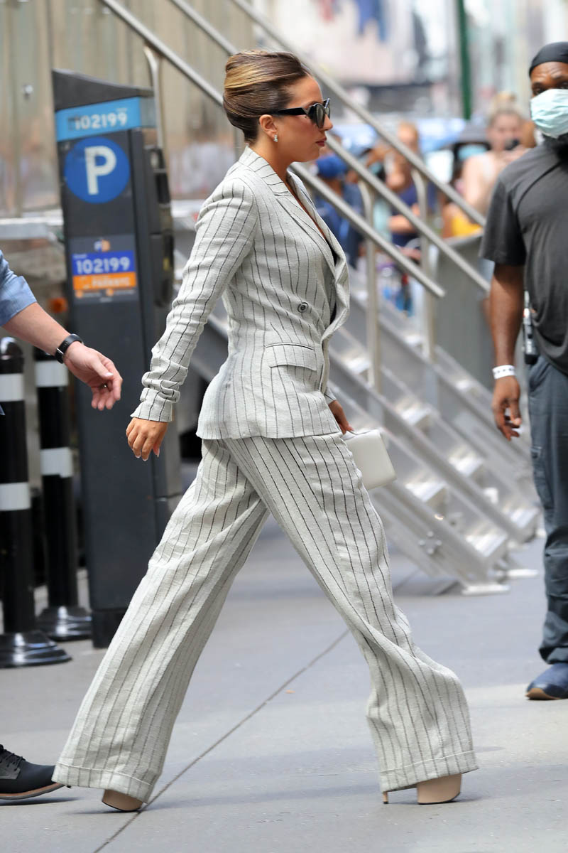Finally, yesterday, Gaga was all business, working a white pinstripe wide-legged suit. And remember, the wardrobe we’ve been seeing? It’s all been for REHEARSALS! What will be seeing on show nights?!