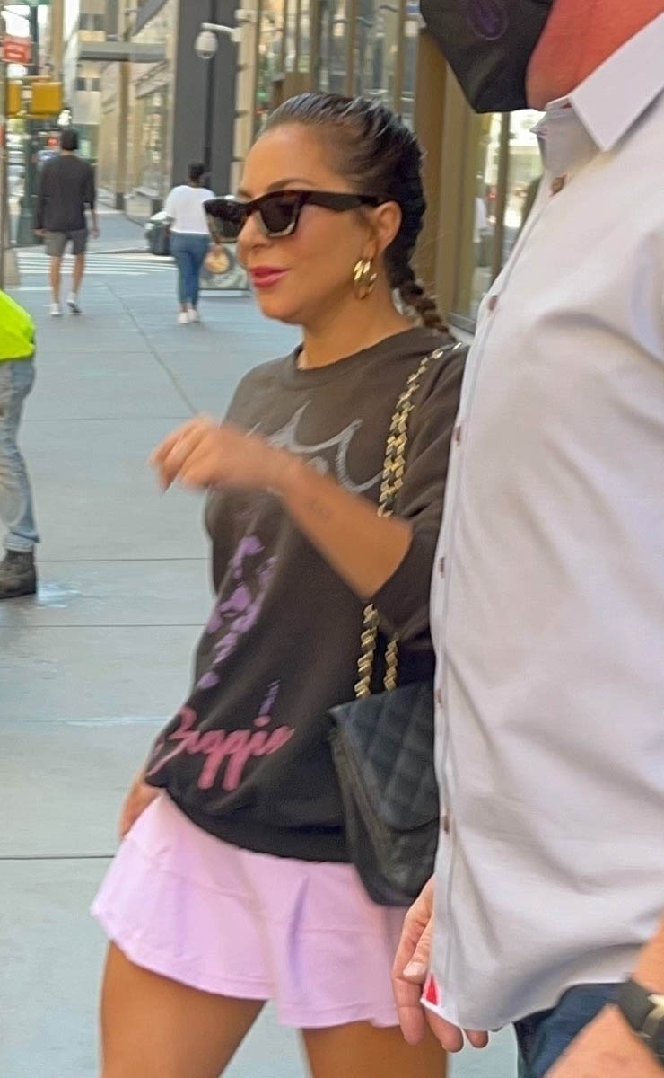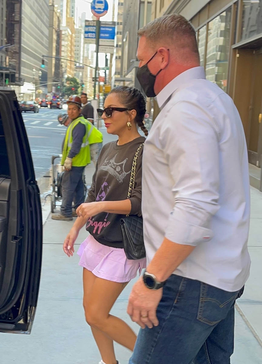 The next day, perhaps surprisingly, it was a much more casual Gaga in a Biggie sweatshirt over a pink tennis skirt and sneakers. Maybe she was heading to the gym.