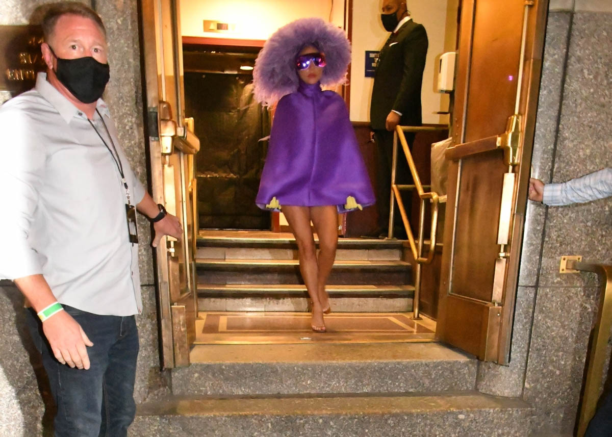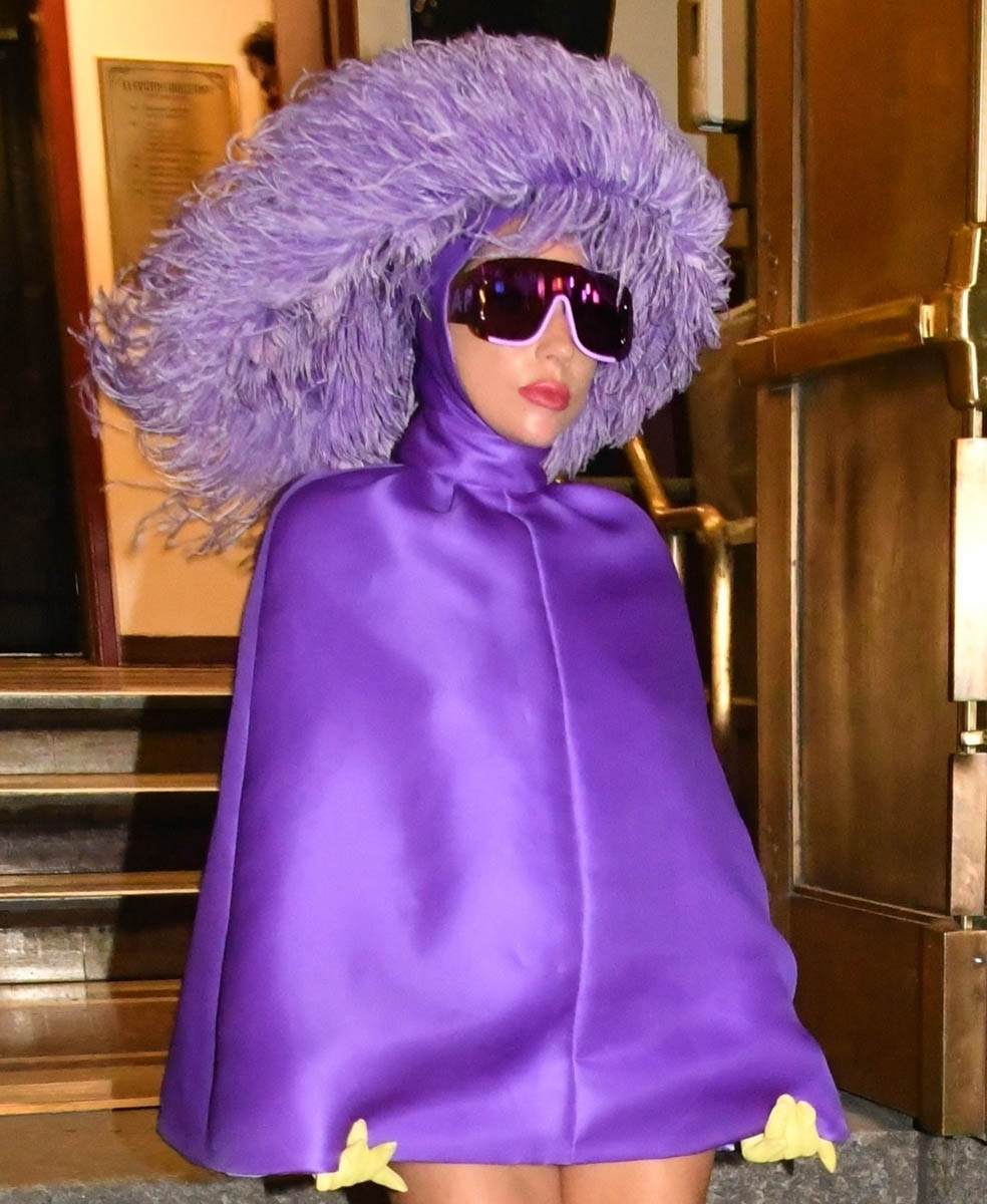 Then in the evening, while leaving Radio City Music Hall, Gaga brought the drama, combining movies and theatre with a purple cape dress, and an elaborate headpiece, the merging of all her entertainment lanes: this is theatre and arena, this is popstar and film goddess: