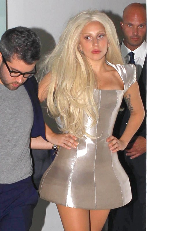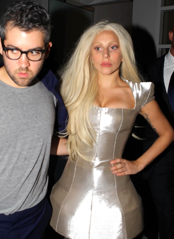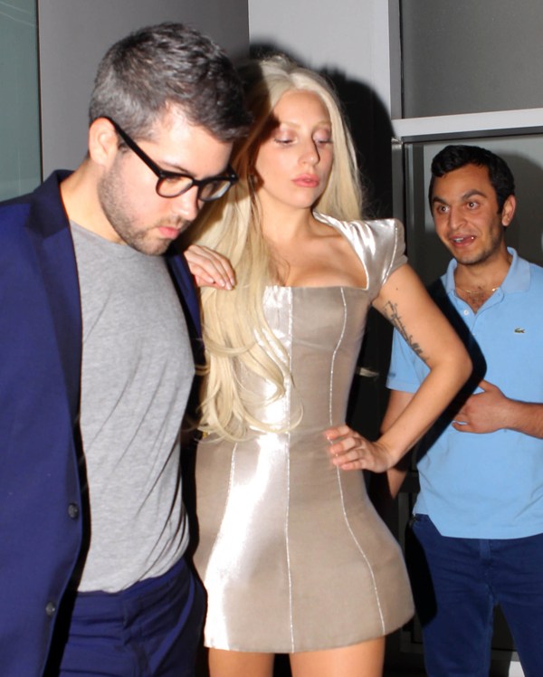 Anyway, Gaga was out in New York yesterday. She went to a gallery for an exhibit in a silver dress, a blonde wig, and “natural” makeup. Earlier she stepped out in a brown wig and a black bra, at one point driving around with her feet out the window. My first thought when I saw those shots was – oh other people do that too?
