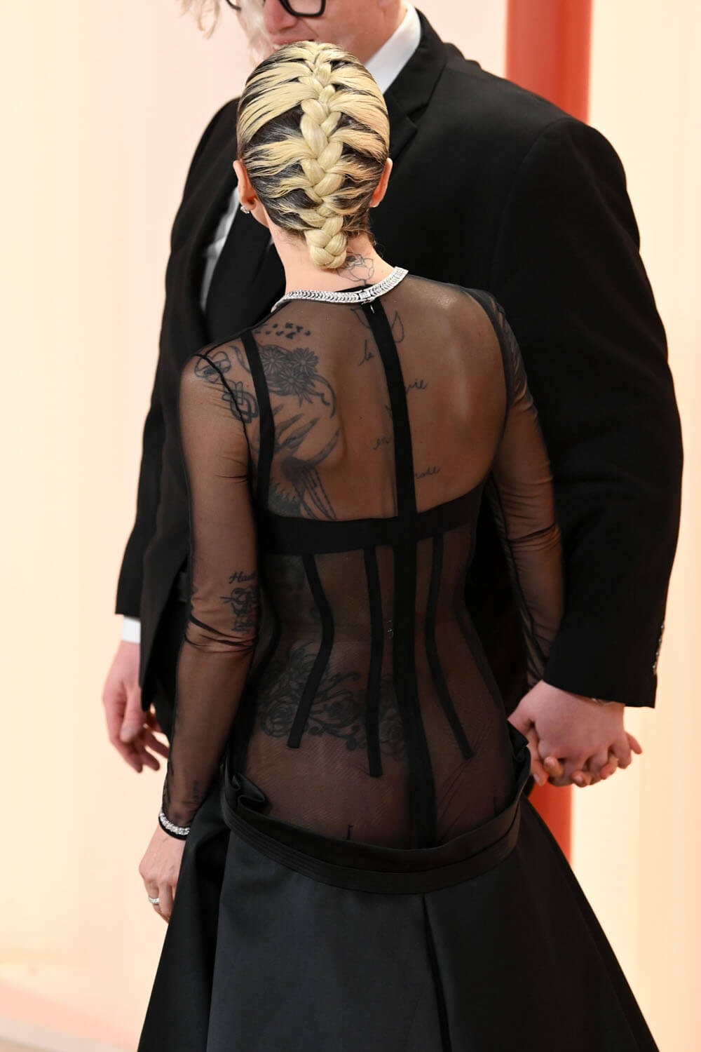 The dress, to my eye, is less provocative on Gigi’s length. On Gaga, the sheer parts along the ribcage make more of an impact, and the sheer over the top half of her ass definitely make more of an impact. It’s such a good fit on her, and the drop waist from the sheer and the exposed corseting, is such an interesting design feature. What I especially like about this design is that it’s both familiar and reimagined, because we all know this silhouette: Victorian style corset dressing, that shape is recognisable anywhere, but of course we never imagine it to be sheer through the midsection. This is exactly how you modernise something traditional and the perfect choice for a star who can go back and forth between both.
