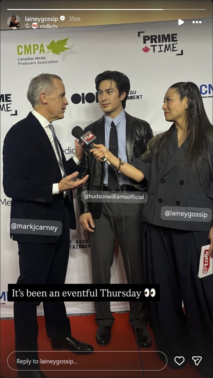 The reason I edited the site yesterday is because Lainey had to go to Ottawa…to moderate a panel at Prime Time 2026, hosted by the Canadian Media Producers Association. She was on the red carpet with PM Mark Carney and Hudson Williams: