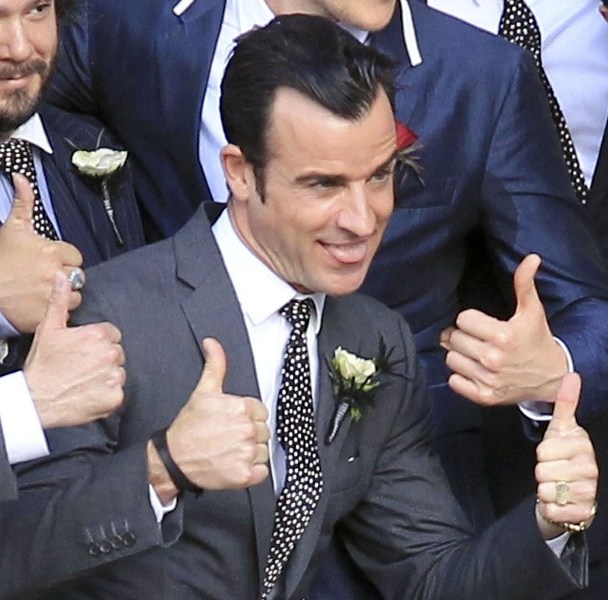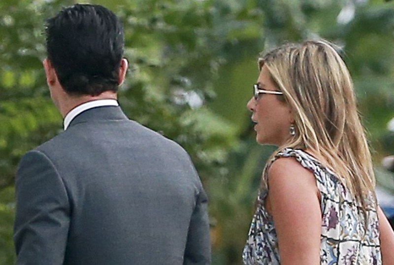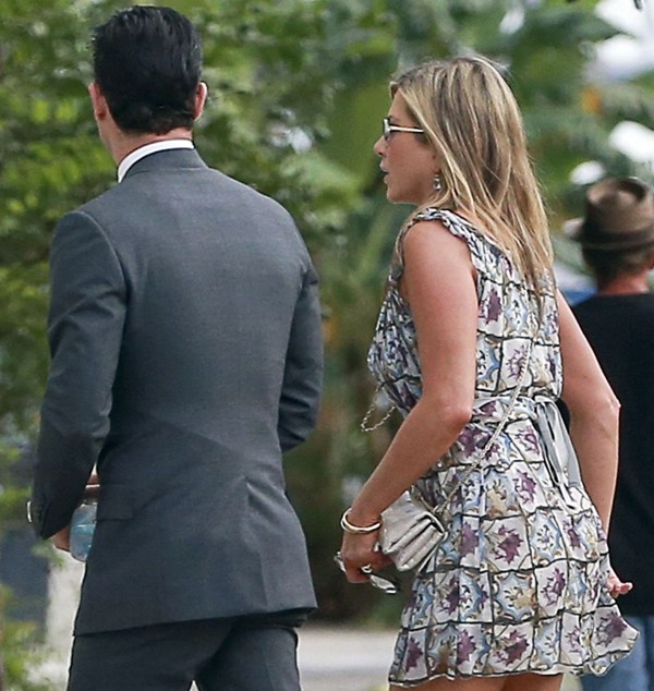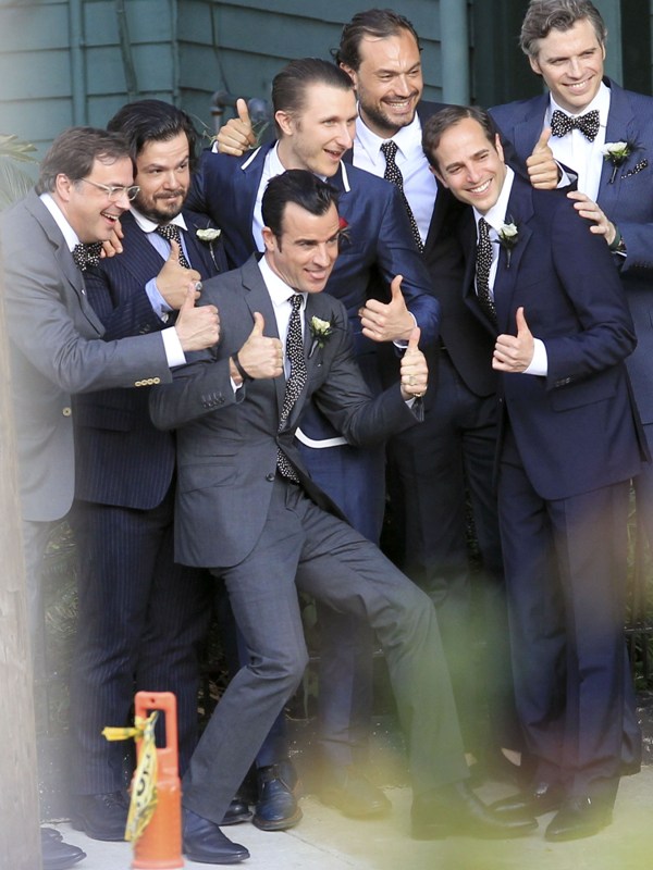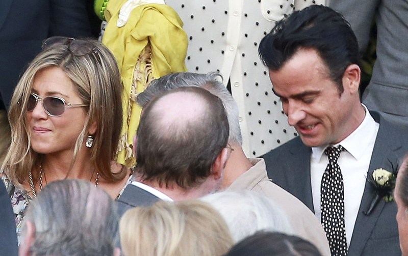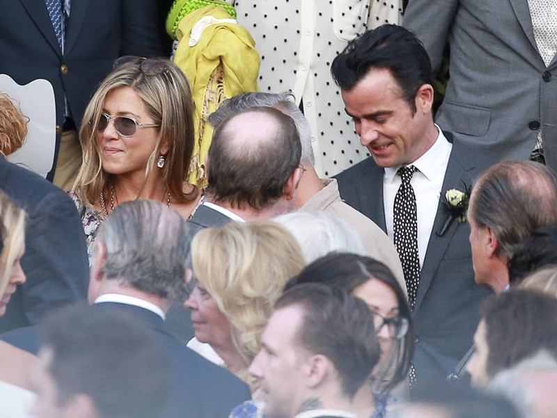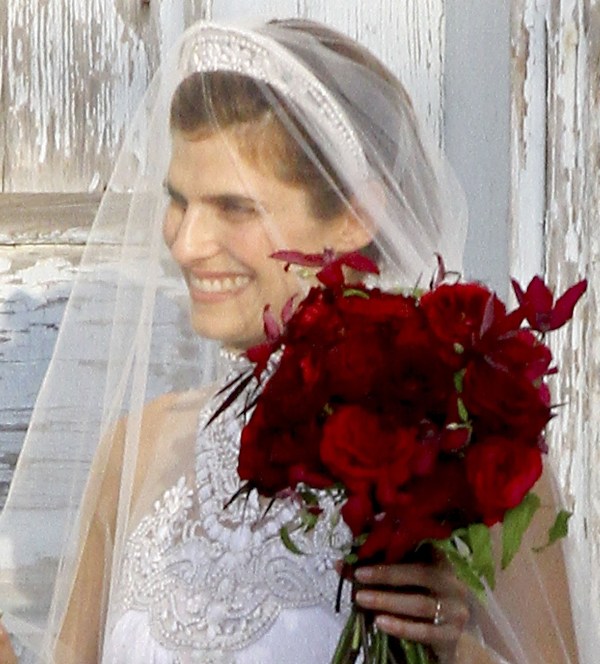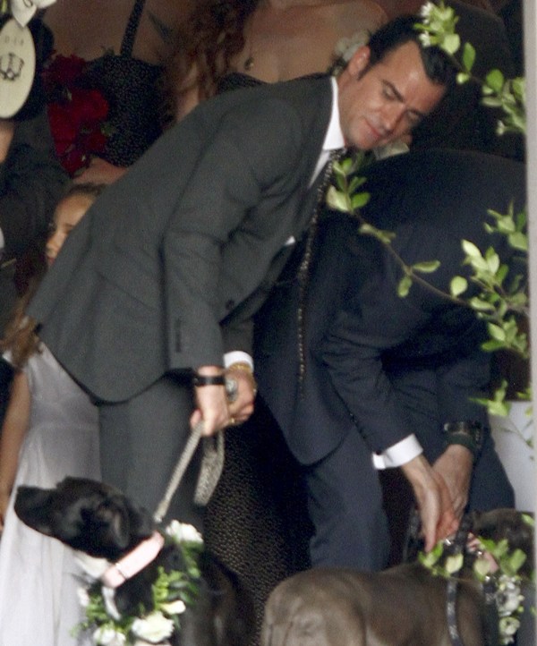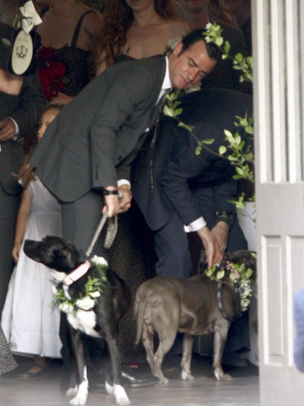 Lake had some very famous names on her guest list, including Jennifer Aniston and Justin Theroux who appeared to be in the wedding party. He helped out with the dogs. Jen’s dress is a recycle. She wore it to her hand and footprint ceremony at Grauman’s a couple of years ago, remember? Click here for a refresher. It’s Prada. Since we’re on the subject of weddings, when will Jen and Justin’s be?