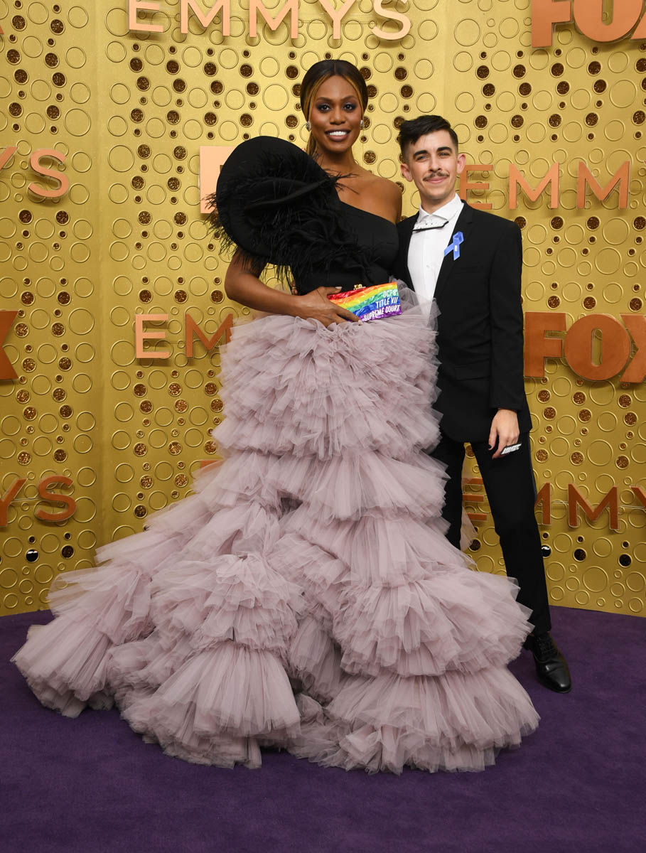 It says “Oct 8 – Title VII – Supreme Court”. It’s an upcoming court case that will determine whether federal law bans discrimination based on trans status. She brought the ACLU lawyer who’s going to argue it, Chase Strangio, as her guest on the carpet. It’s awesome, and I love the way that celebrities have found a way to hack the carpets and make them work for them, so they don’t feel they have to put the rest of their lives aside, or feel disingenuous if they’re not using their platform to promote what’s important to them, either in their accessories or guests or acceptance speeches, if they’re so lucky. It’s enterprising (for good) and surprising.