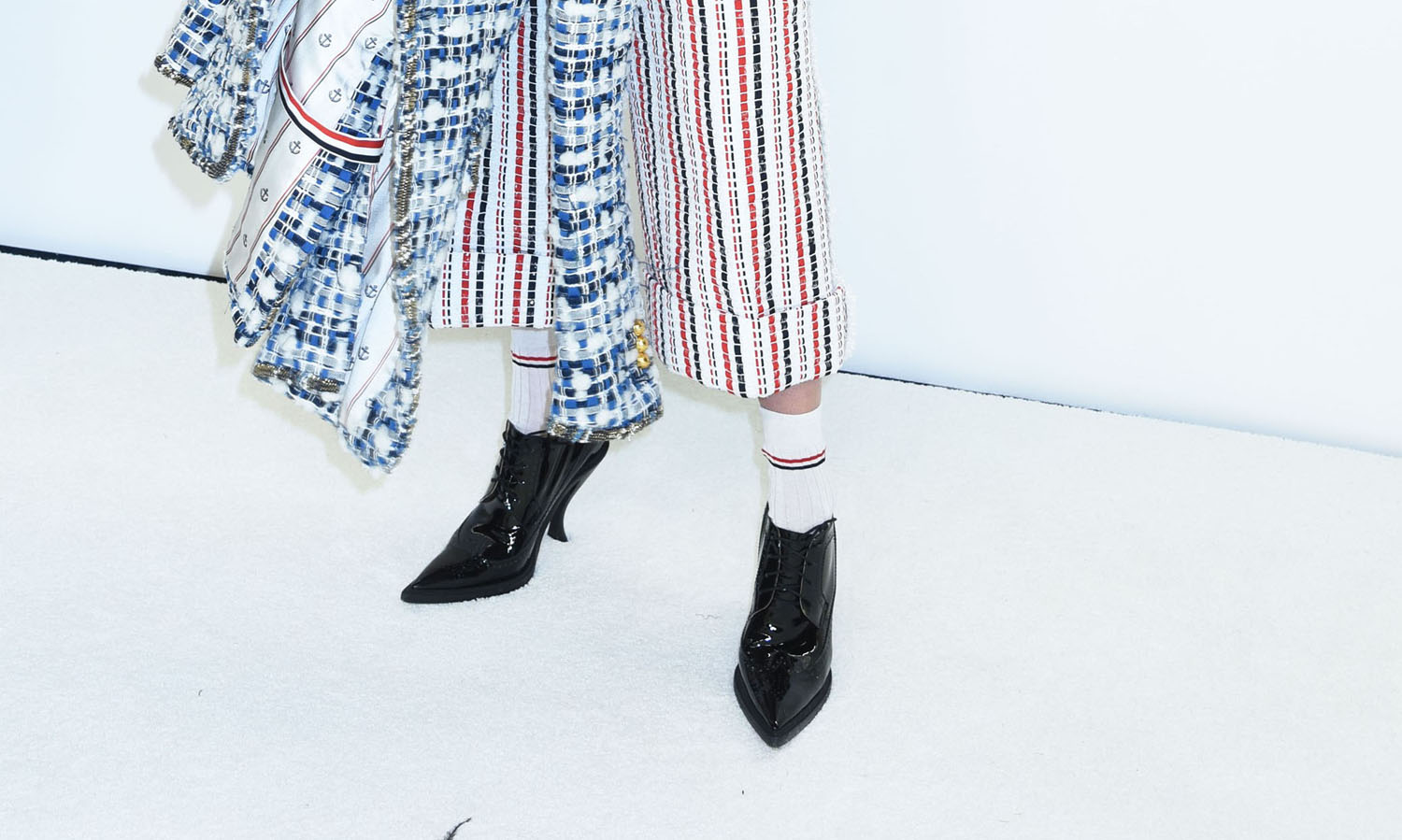 This is Thom Browne, unmistakably. And layers and layers of Tom Browne. From the crisp classic shirt but cropped, with a plaid frayed vest on top, then a frayed jacket in a different colour and print, clashing with striped pants, with the underband pulled up, and the socks worn above the ankle, and the black patent booties…
