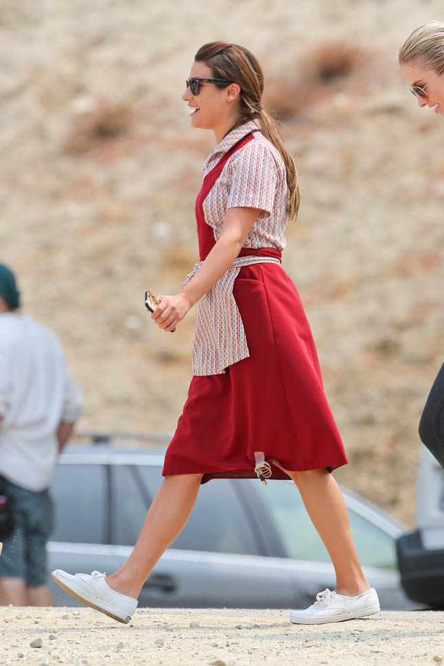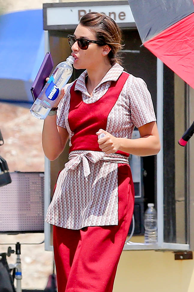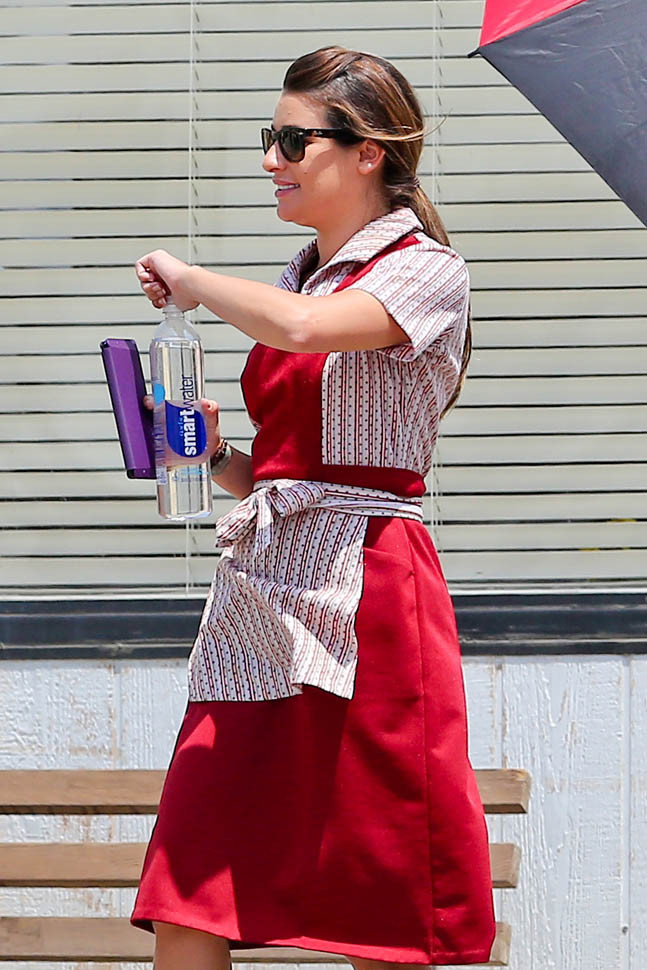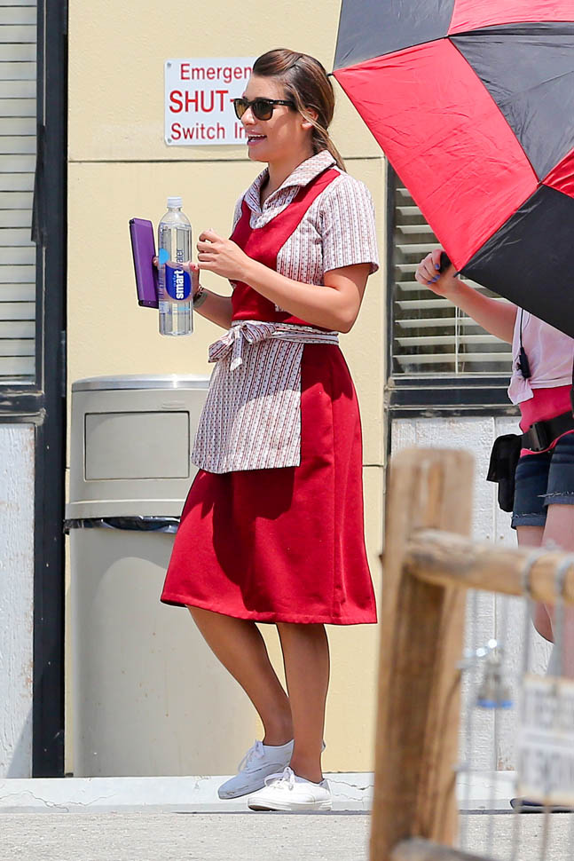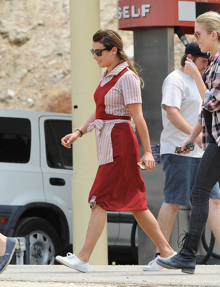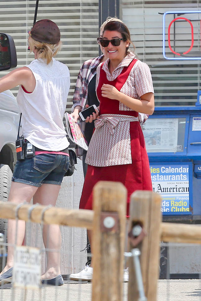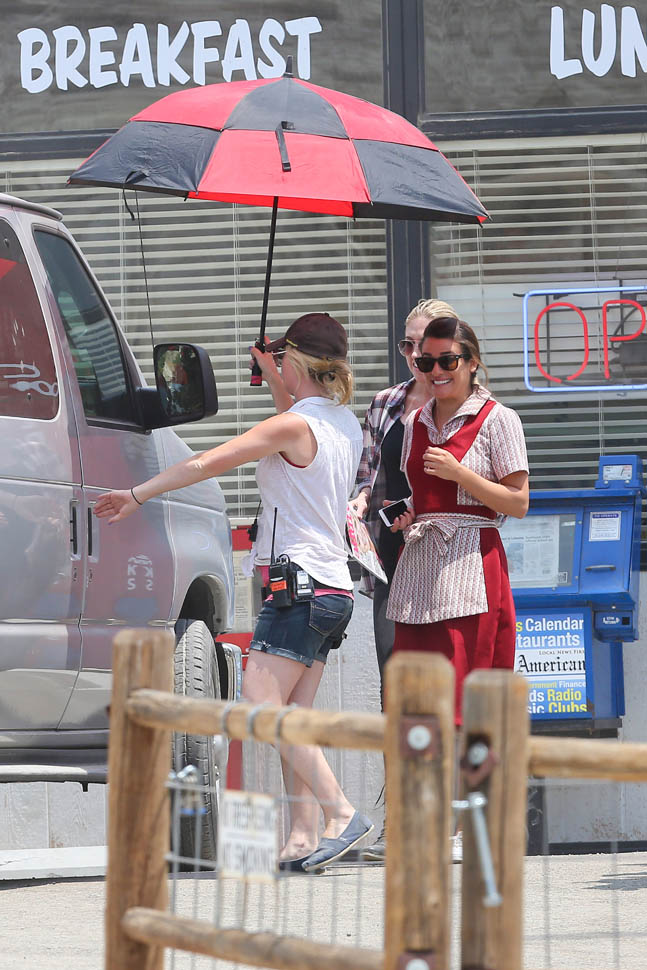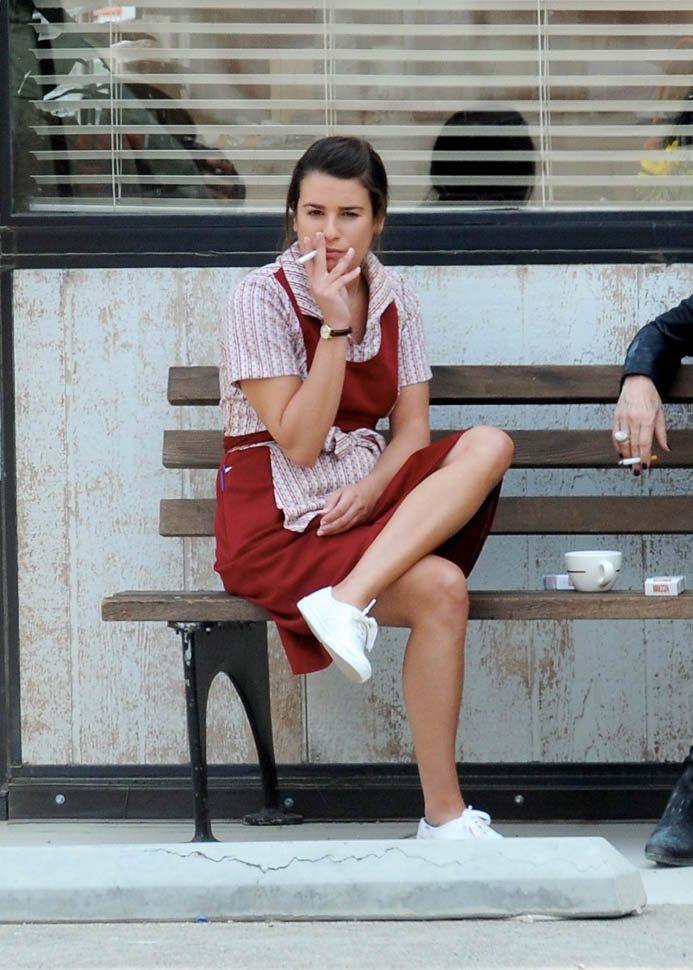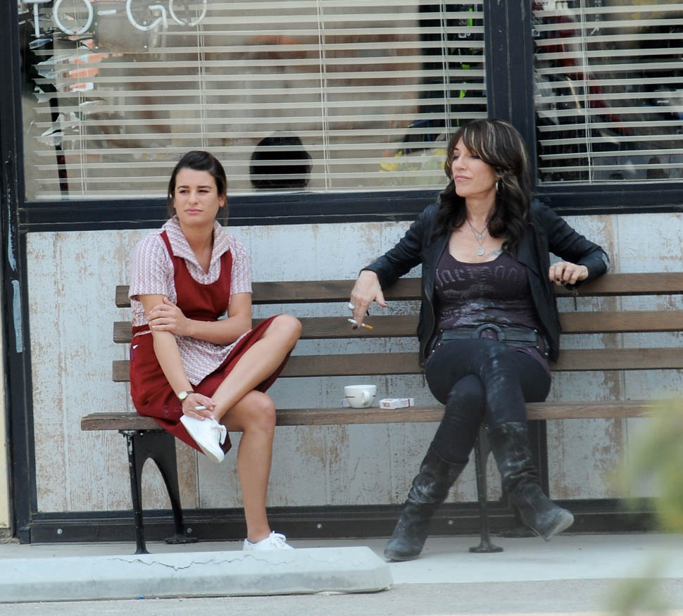 Lea Michele continues to work on Sons Of Anarchy. Here she is shooting a scene with Katey Sagal yesterday. As I wrote earlier this week, with the imminent conclusion of Glee, Lea’s professional strategy seems to be an image change. This is not Rachel Berry hanging out with Gemma Teller Morrow. This is a Lea Michele reset. No more kilts and knee-high socks. No berets, cardigans, Barbra Streisand, argyle vests …