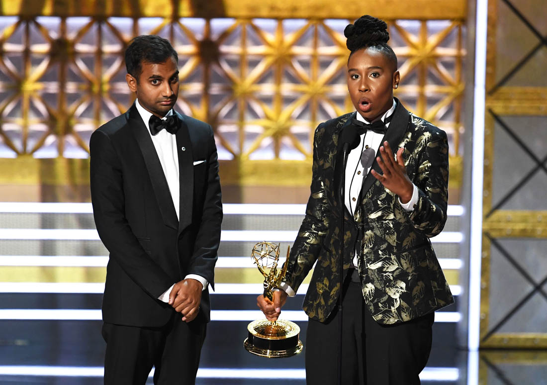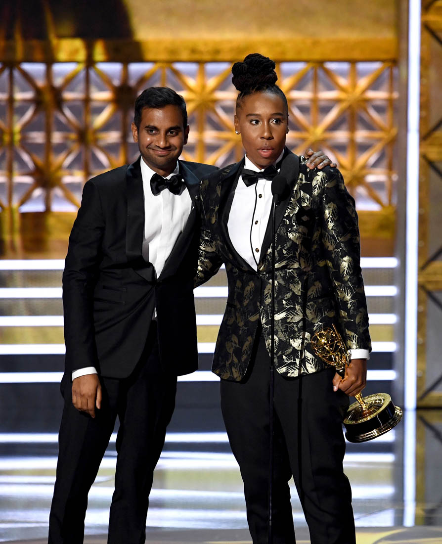 Lena Waithe, in her first ever win, first ever time at the mic, does just that. First of all, she ‘reclaims her time’ because the audience’s all-out cheering and the standing ovation is cutting into her speech time– then proceeds to skillfully and gracefully, without a stammer or a nervous glance to silent, proud Aziz, accept the award, make it personal by thanking her family, then explain to ‘my LGBTQIA family’ that they are superheroes. My favourite quote: