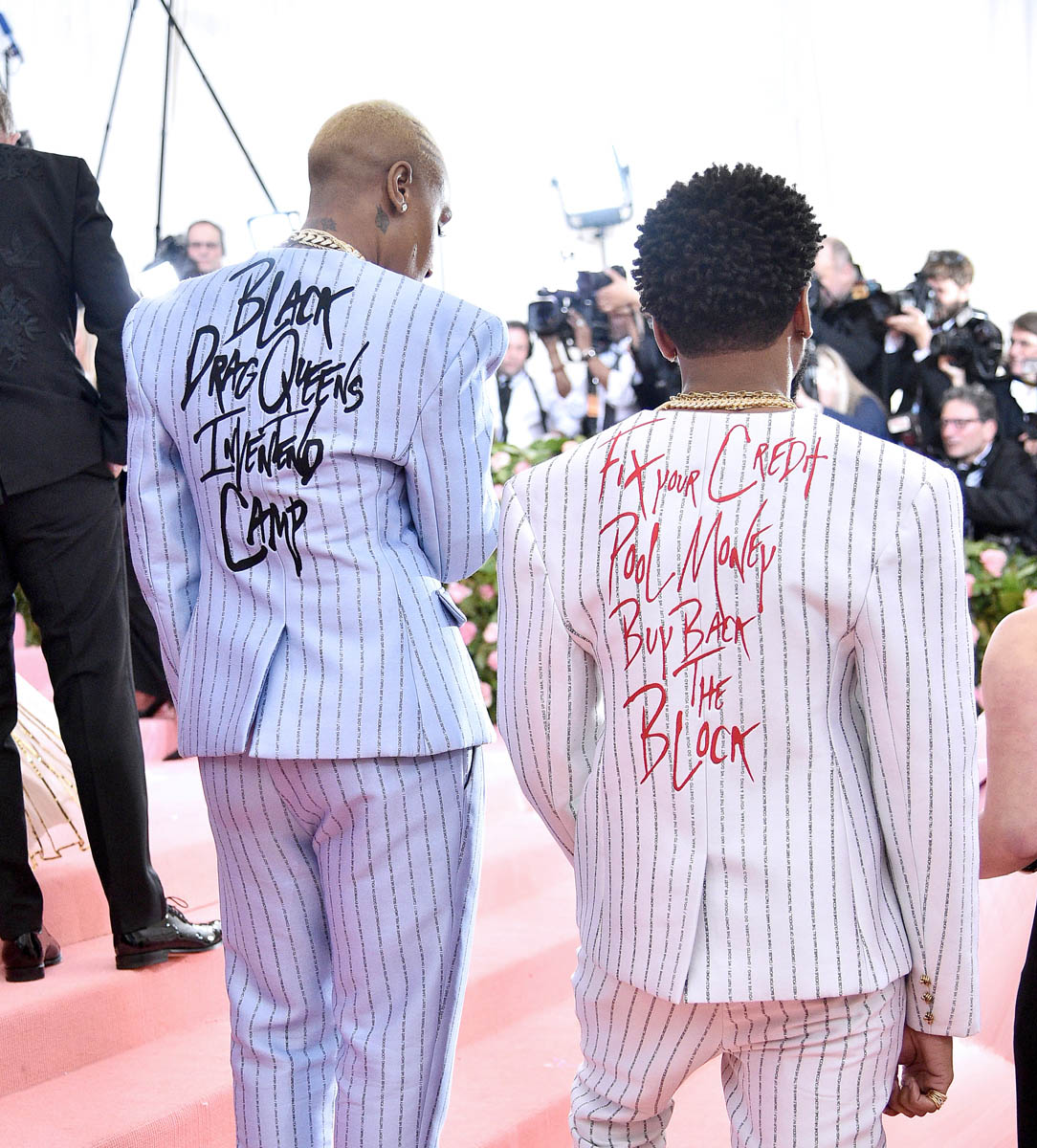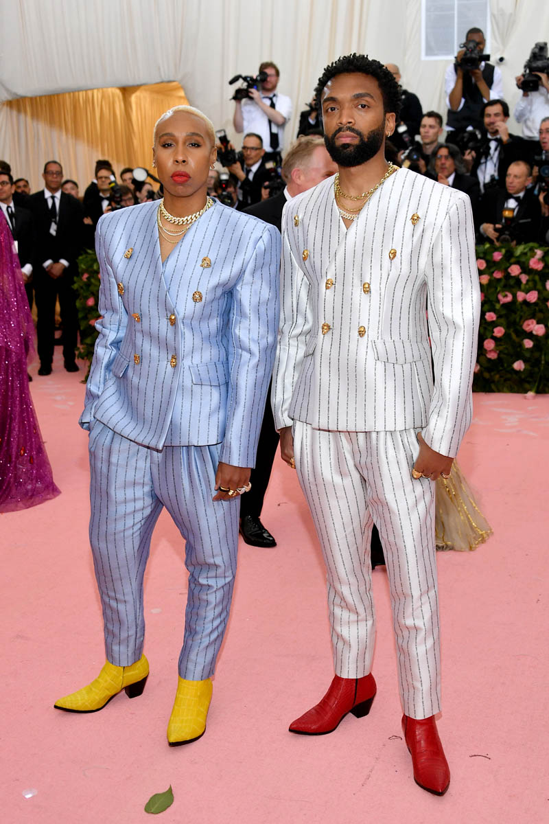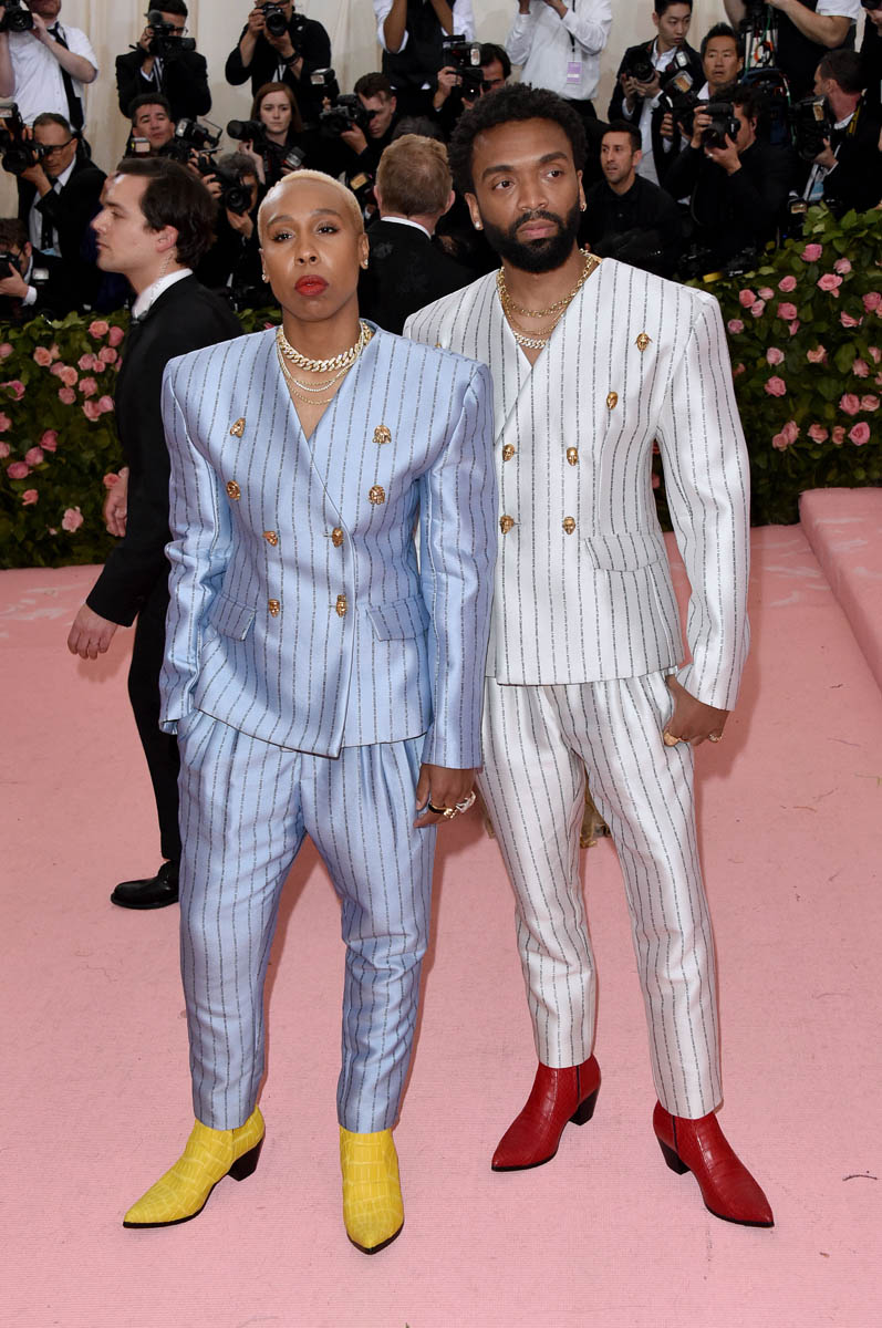 As Prem wrote yesterday in his post about Camp, “the Met exhibition focuses on the white history of Camp, largely ignoring the contributions of black Camp and Camp in other countries”. Lena Waithe was not about to let that slide, showing up to the event in Pyer Moss alongside designer Kerby Jean-Raymond in matching pinstriped suits with song lyrics written into the lines: Diana Ross’s “I’m Coming Out” and Sylvester’s “Mighty Real”. Of course you can’t stomp a statement into the carpet without the right footwear. These boots are certified.