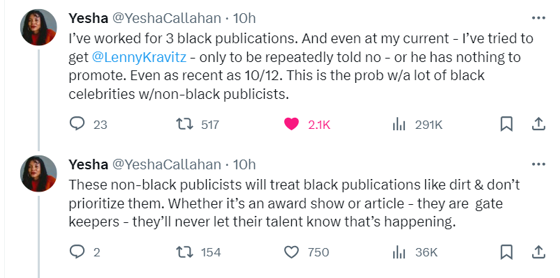 She goes on to say that non-Black publicists don’t regard Black publications as highly as they do white ones, and suggests they are “gatekeeping” Black talent like Lenny from publications that do, in fact, want to celebrate them, but are not seen as worthwhile as other outlets might be. She then linked to a BET article that spotlights alternative Black artists that make country and rock music, showing that BET does feature rockers like Lenny…just not Lenny himself.