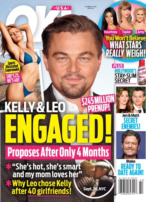 OK! Magazine reported last week that Leonardo DiCaprio proposed to his current bonafide, Kelly Rohrbach, over dinner in New York on September 26. According to the magazine’s sources, it was a spontaneous thing. Like he was enjoying his steak so much that he decided to ask her to marry him. Obvious bullsh-t but here’s the cover: