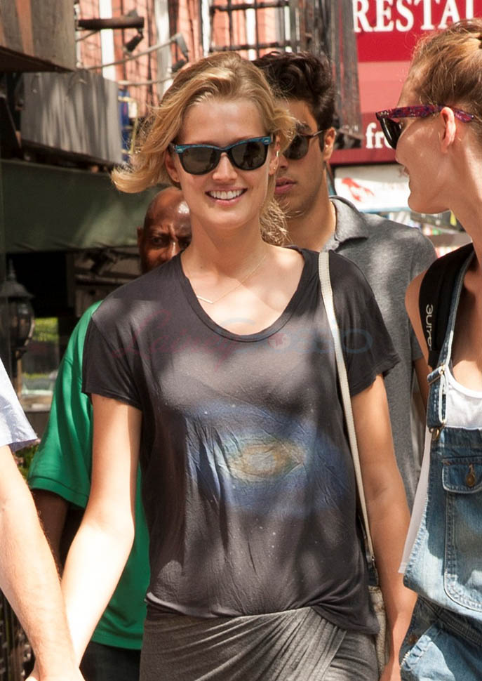 But here’s Leo in New York yesterday, with Toni Garrn, holding hands, and she’s smiling and happy, and while his head is down, he’s not running away, throwing himself into a dumpster. For a change.