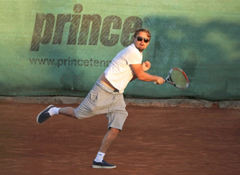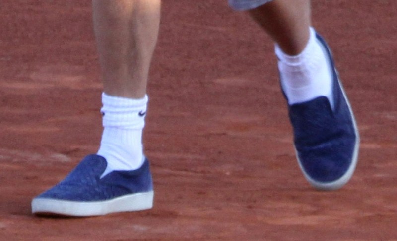 Leo’s not wearing heels, no. But these aren’t proper tennis shoes. These are a twisted ankle waiting to happen, especially on a clay court. Then again, maybe he’s not trying that hard.