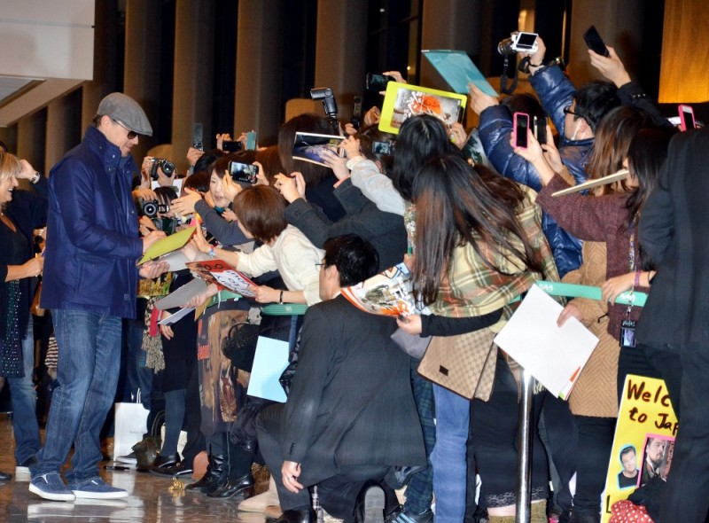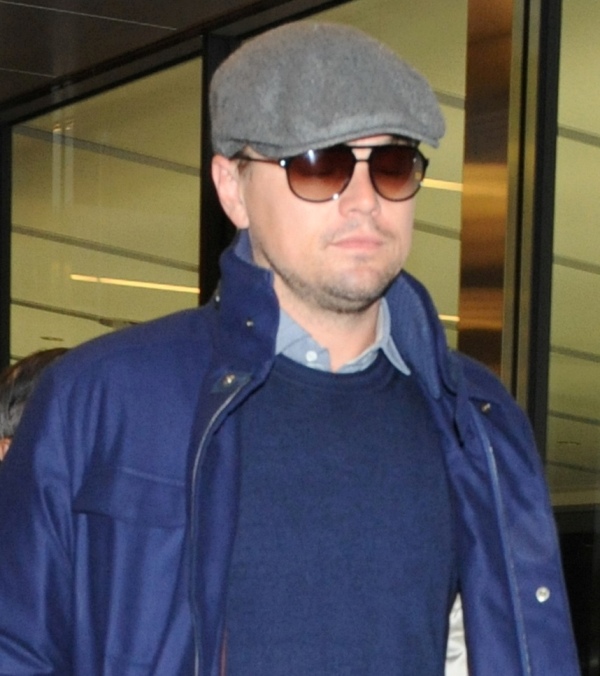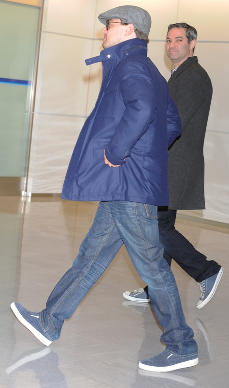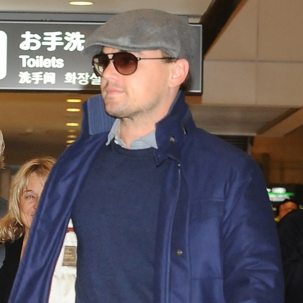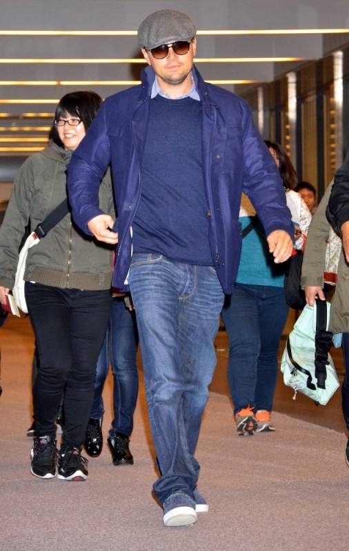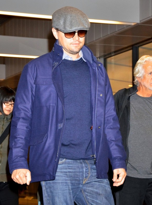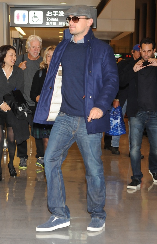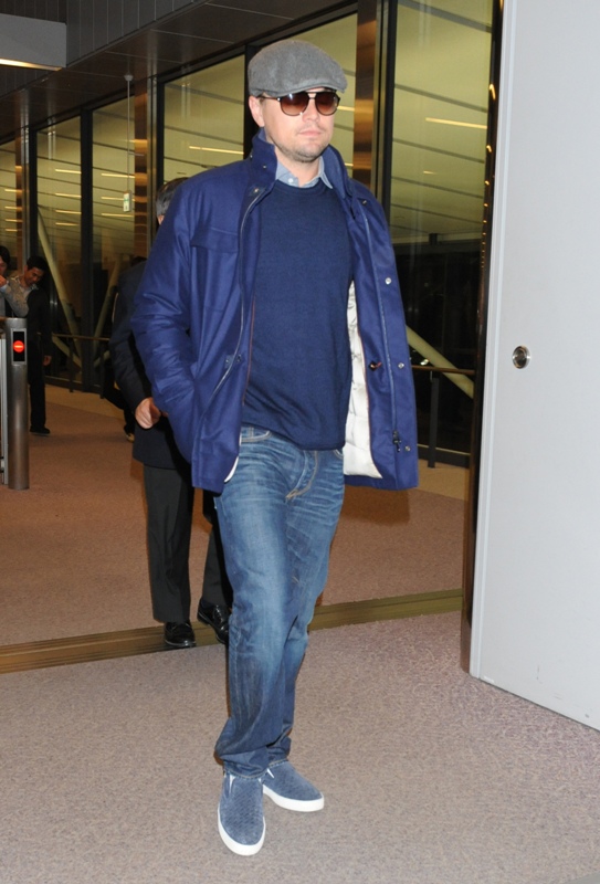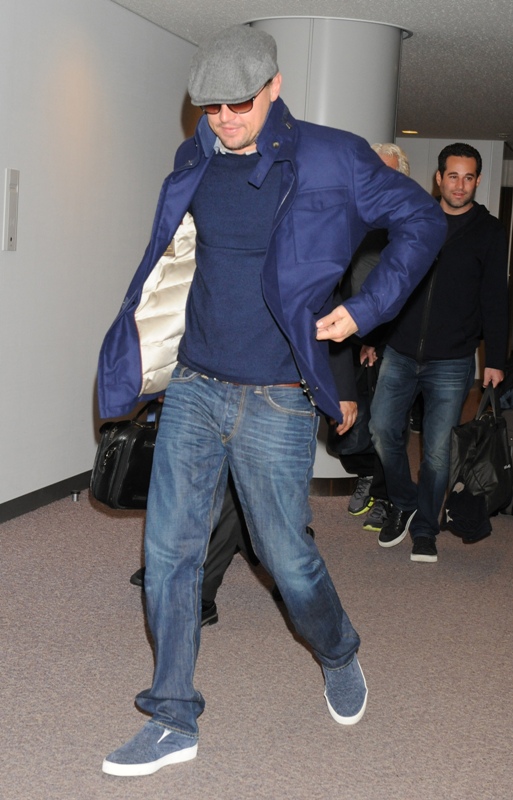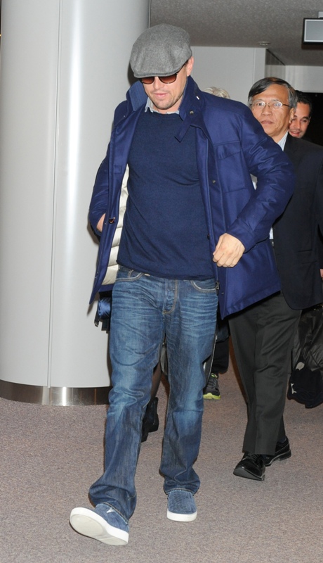 Here’s Leo arriving in Tokyo today. Morley and I kept saying to each other how good he looked last week when we saw him at the Weinstein Grey Goose pre-Oscar party on Saturday at Soho House flirting with Jennifer Lawrence -- click here for a refresher. Definitely better in person than in photographs and totally not as bloated. He was dressed similarly to what you’re seeing here only it was a grey sweater and not a blue one and a t-shirt underneath instead of a button-down. Same cap though and a tan, or it could have been alcohol, seeing as at one point he was double-fisting Grey Goose and soda.