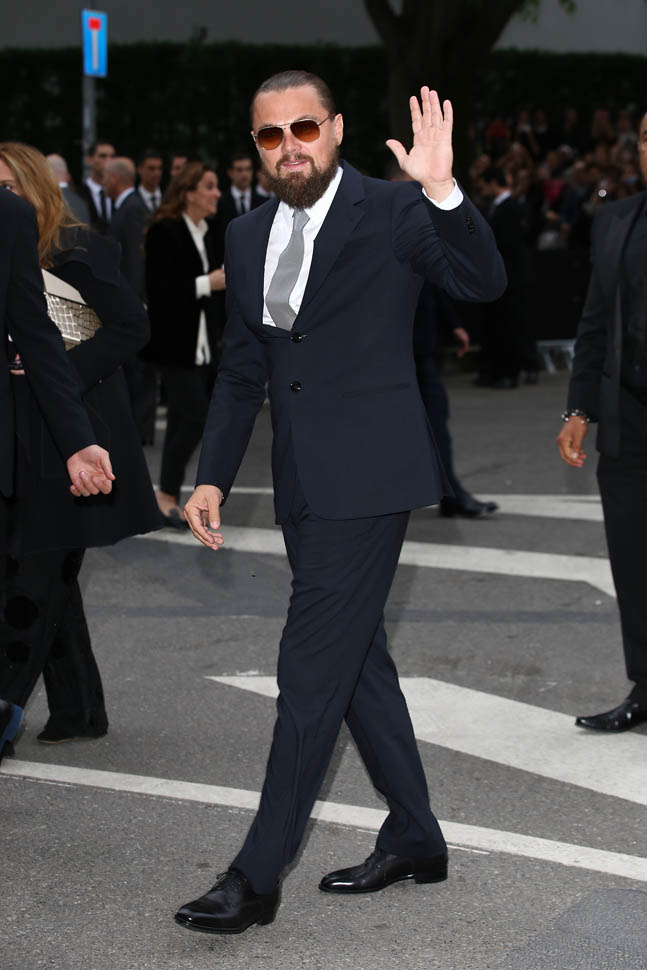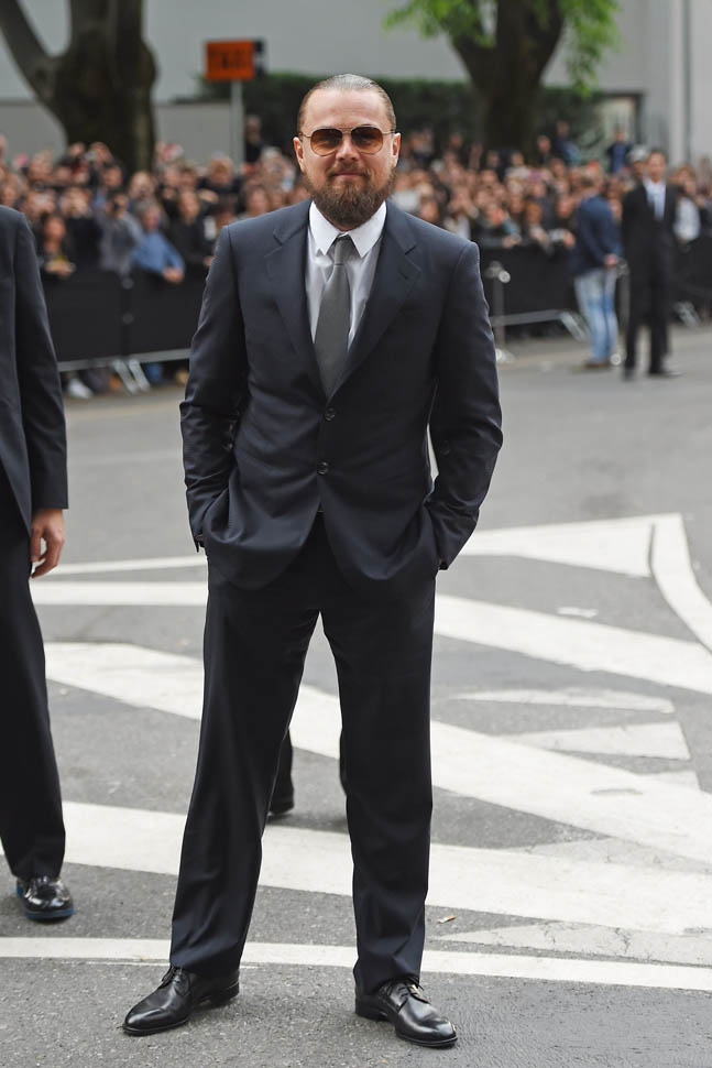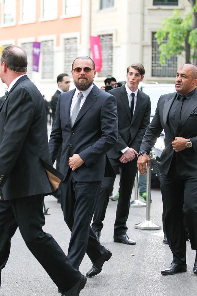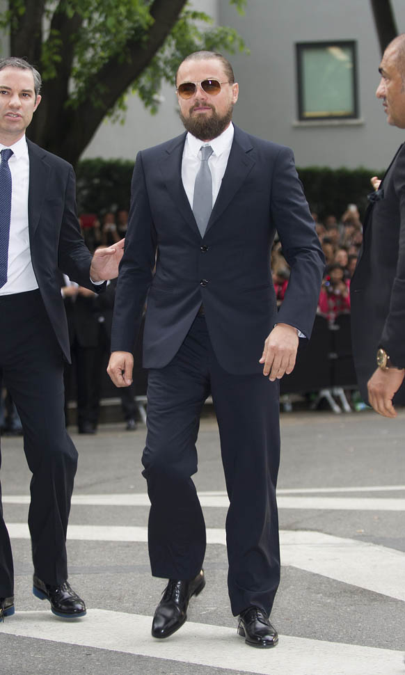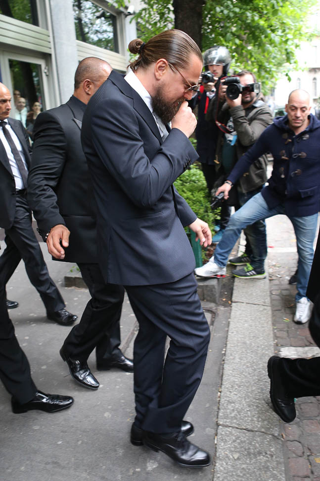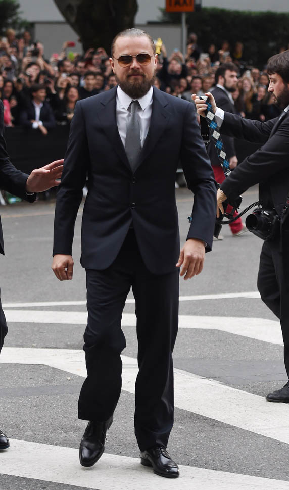 Yesterday I posted photos of Leonardo DiCaprio acting the fool, hiding under a blanket/scarf while out in Milan. Here he is arriving at the Armani 40 anniversary party last night. What happened to the hot? The hot cannot be found. The hot has been missing for a while now.