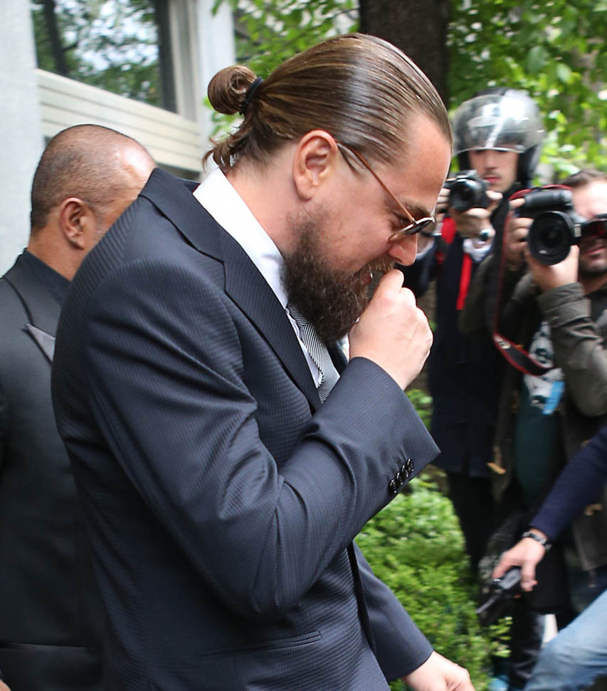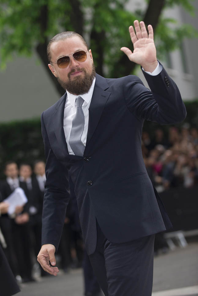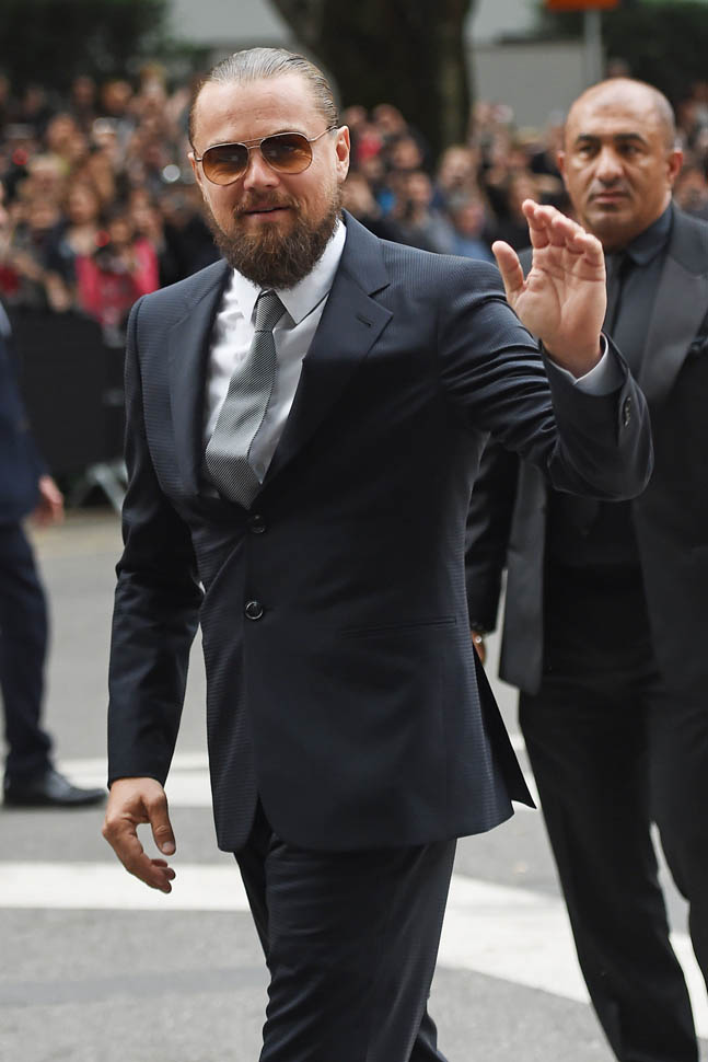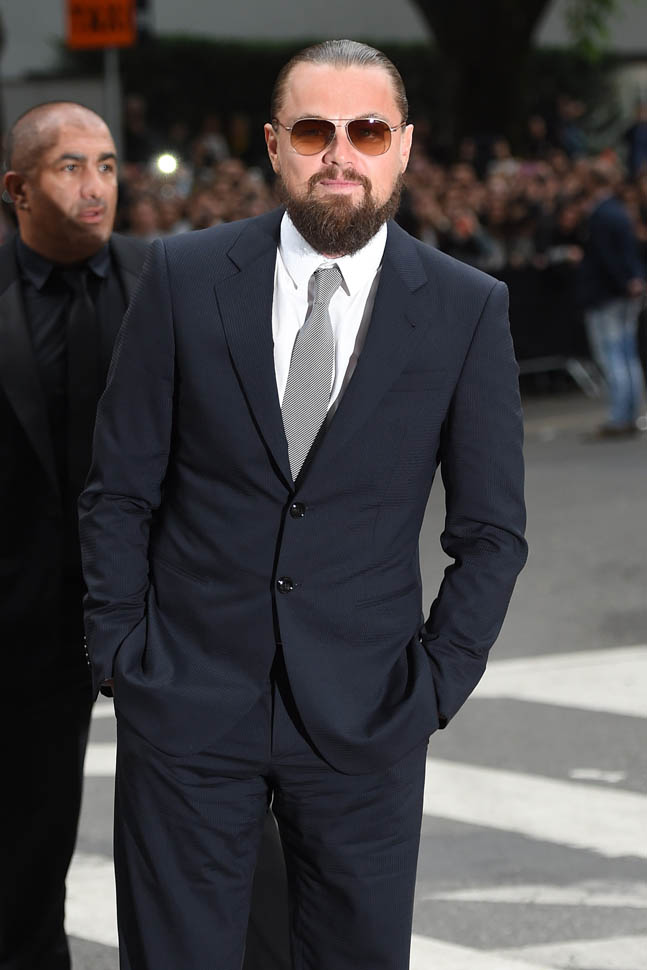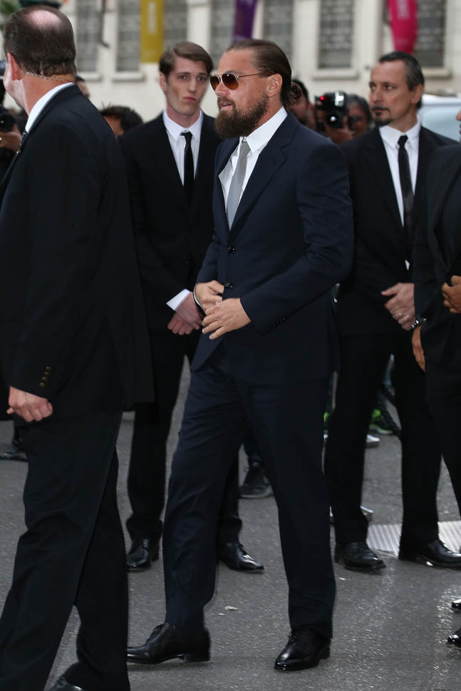 Yesterday I posted photos of Leonardo DiCaprio acting the fool, hiding under a blanket/scarf while out in Milan. Here he is arriving at the Armani 40 anniversary party last night. What happened to the hot? The hot cannot be found. The hot has been missing for a while now.