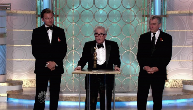 Mostly it’s the status. To sit next to Martin Scorsese, the legendary director’s current muse, and to stand with Robert DeNiro to present his award, the two flanking a Hollywood visionary as he’s honoured by the industry, on a night when the other director who turned him into a household teenybop superstar took home the big prize. Leo did nothing to mask his fontrum during James Cameron’s Give It Up For Yourselves cheese, and before that – did you see? – he stayed seated as Cameron came over to HIS table to pay respects to Marty, because while Titanic certainly got him started, Leo D undoubtedly earned the rest. With good decisions, with great acting, with great strategy, and with smart connections. He is the standard. You think a blockbuster gift card is an automatic? Please. See Orlando Bloom if you want the flipside.