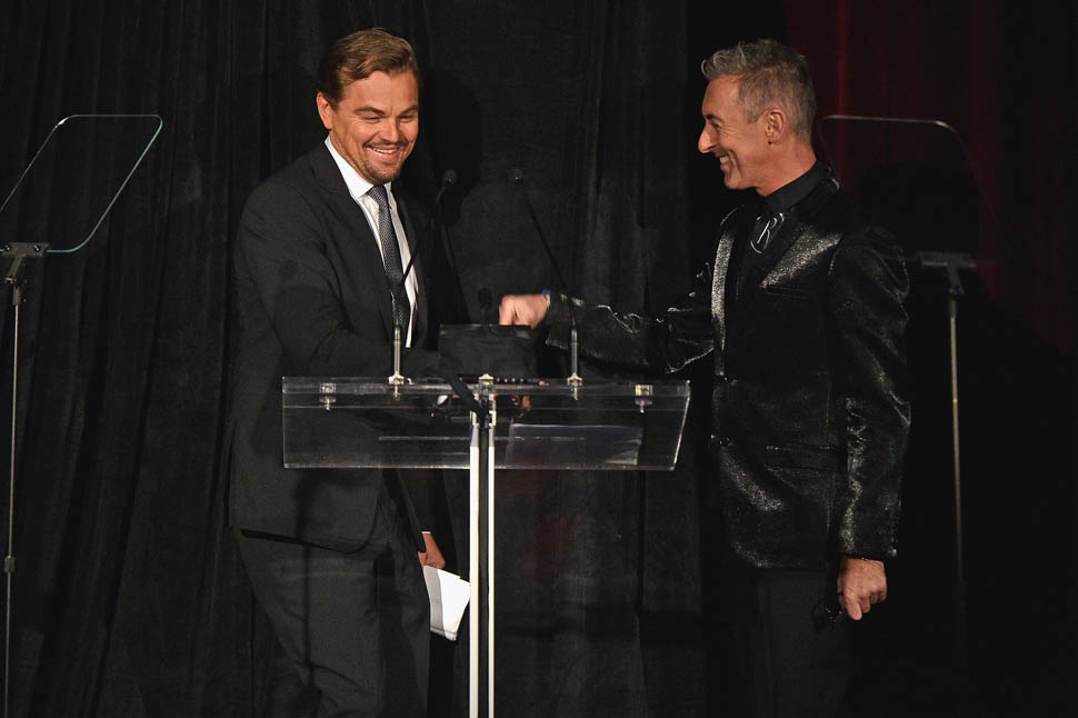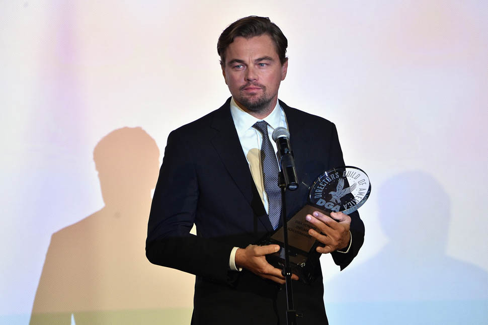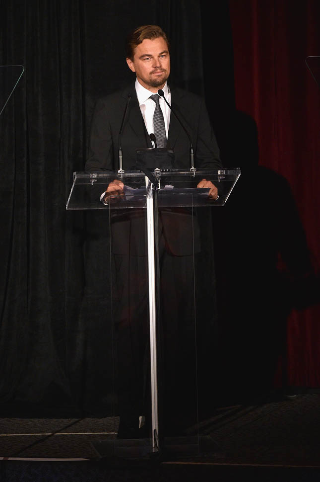 Here he is last night in New York at the Directors Guild Of America Honours Gala presenting to Thelma Schoonmaker (what a great name) who is a long-time Scorsese collaborator. So he’s there for a friend. And he’s also in front of an influential body when it comes to Oscar decision-making. Leo’s in tight with the Scorsese family but it also helps to sell him as a director’s actor, a collaborator, an artist who puts the film first before the performance. Is that enough to put him over Depp and Redmayne and possibly Hanks? Probably not. Much more work to be done. So many alliances to be made. But he’ll look like this the entire stretch. Hair short, facial hair reasonably under control, and firmly, firmly 40.