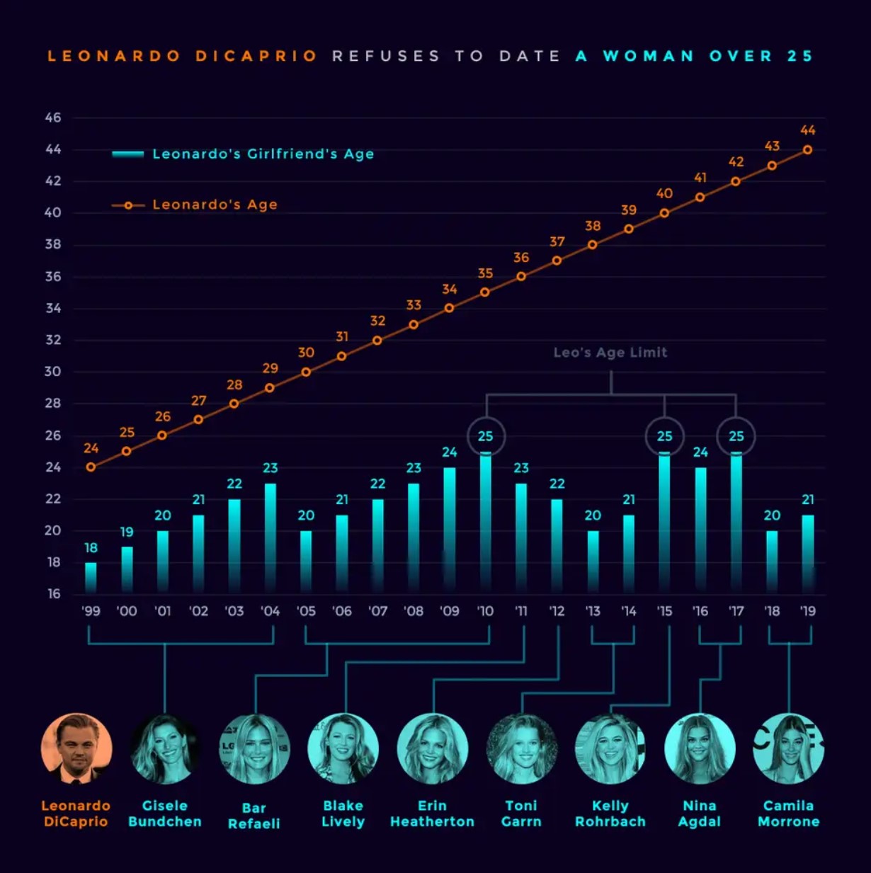 If it’s possible to have a moment of reflection now, this is not about Camila. The discourse is not targeted at her. And if there’s reflection happening about society and young women, the focus is on men, older men, and their attitudes about young women. The focus is on Leonardo DiCaprio and his well-established, well-known pattern of dating women only until they reach the age of 25. Leo has been famous since he was a teenager. And from that point he has never publicly dated a woman over 25 years old. That wasn’t notable when he was in his 20s…but he’s now in his late 40s. By now I’m sure you’ve all seen the graph that’s been circulating for a number of years online:
