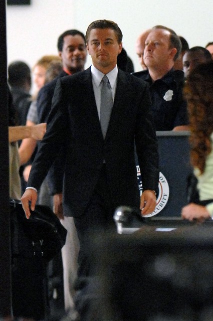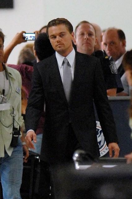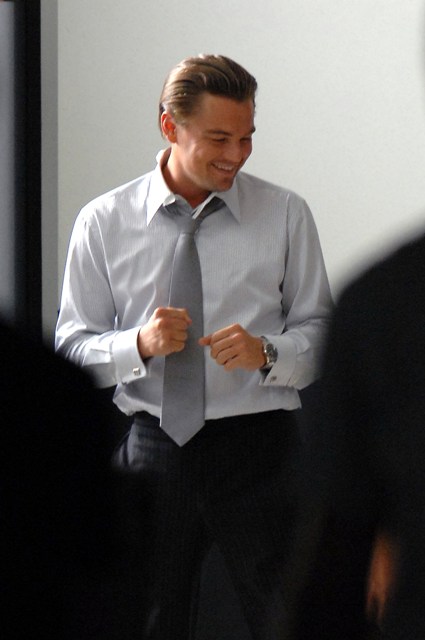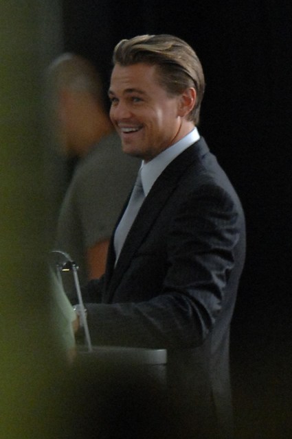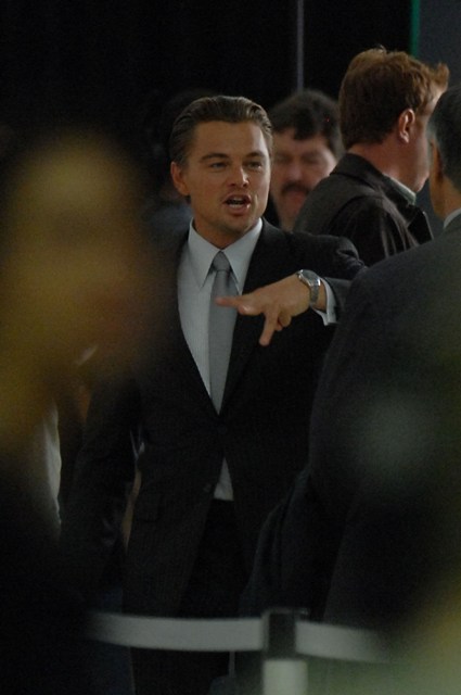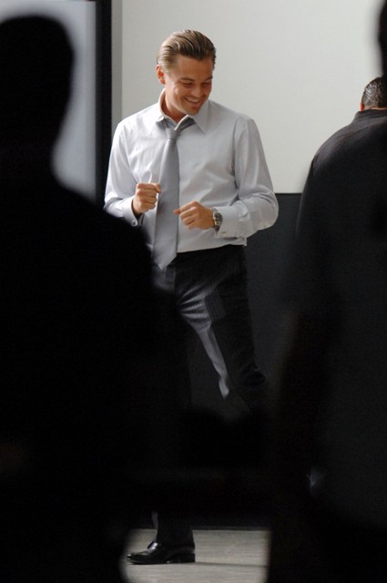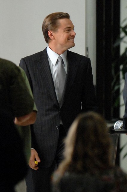Leo was shooting Inception yesterday, loose and relaxed with the crew before putting his serious face back on again to roll. He is great in that suit which is a relief. Because last week there was some bloaty pudge and, well, I can’t do Leo every day, especially not on bloaty days. And when he’s bloated he also tends to waddle. And the combination isn’t conducive to the quiver.