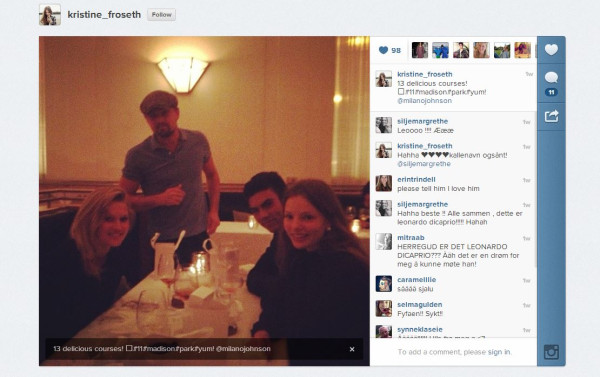 Click here to see a photo of Leo that went up on Instagram a little over a week ago from an account belonging to Kristine Froseth, a model, obviously. She’s around 18, maybe 19. In the picture, she’s tagged someone called Milano Johnson. And of course you can see Leo’s there, with Garrn, who just turned 21, and they’re at a restaurant eating 13 courses. Jonah Johnson is one of Leo’s OGs and his personal chef. He was recently profiled in the LA Times. Click here to read the article. Milano then would be his…son? Also about 18 years old, I think.