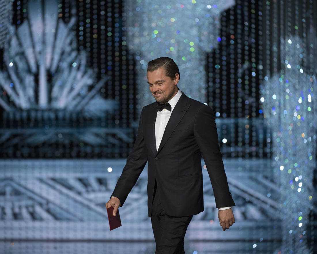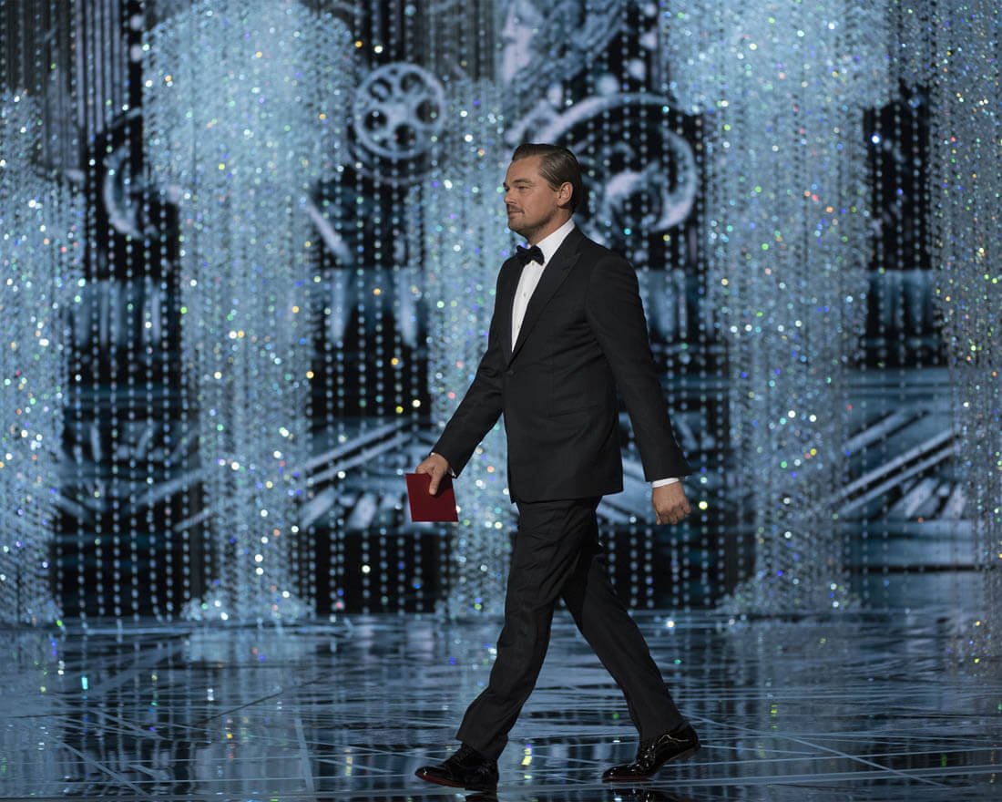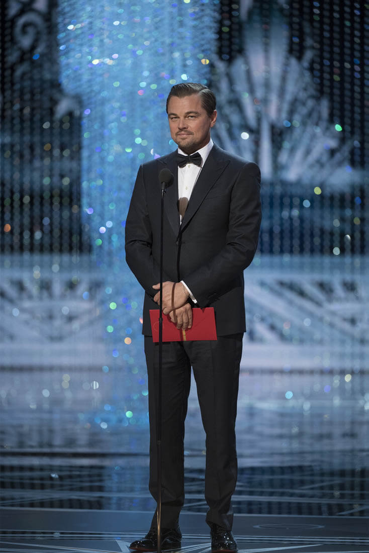 So, since exactly a year ago, Leo has been Academy Award winner, Leonardo DiCaprio. And …can you see the difference it made in his presenting style? Leo’s presented at the Oscars before. But this was his first time presenting as an Oscar winner. He came out of the wings like a peacock. That was a STRUT, a smirking strut, the smirk of a man now imbued with the power to anoint another. And he is getting OFF on that.