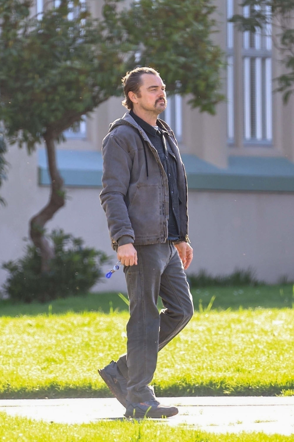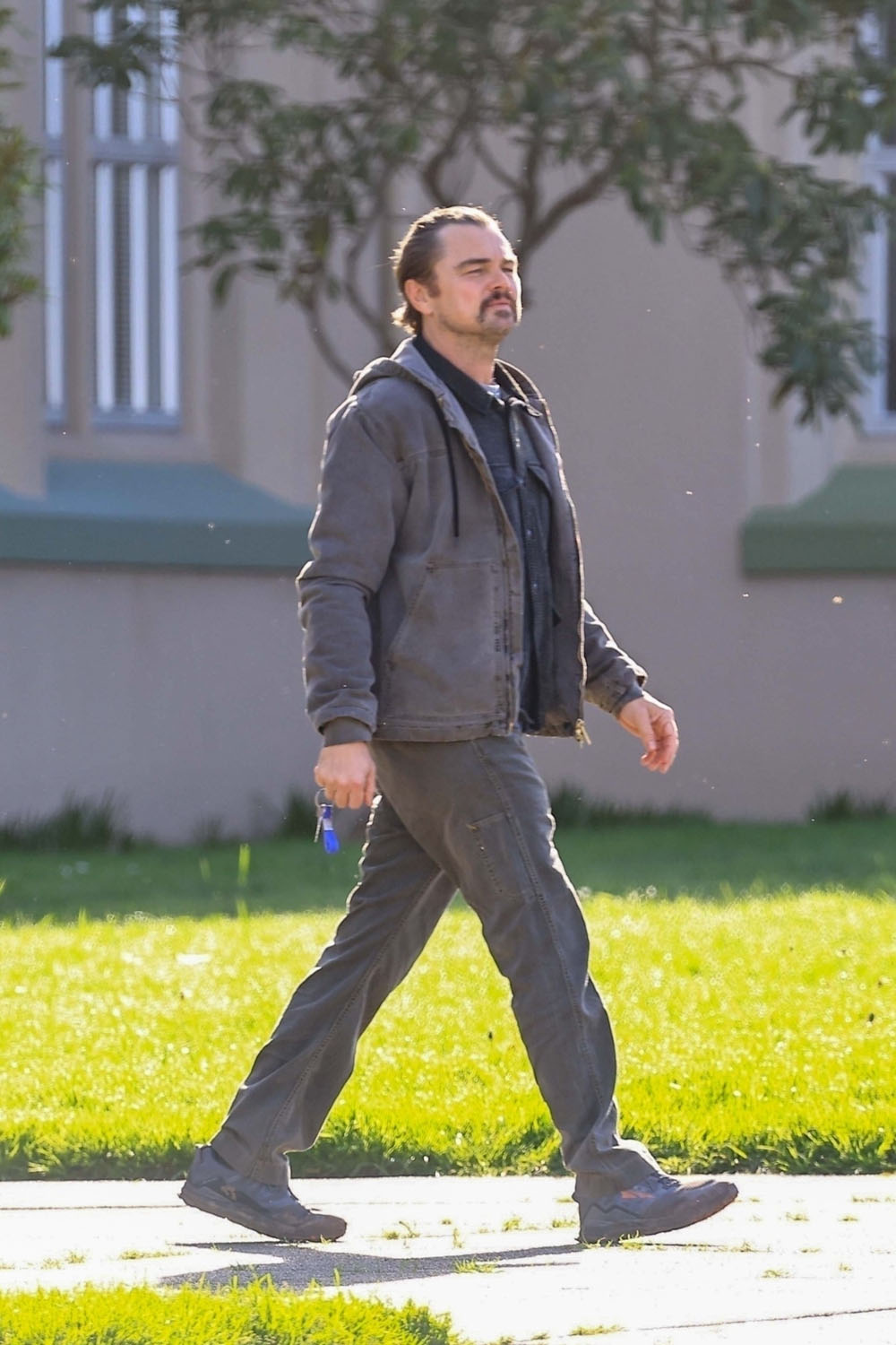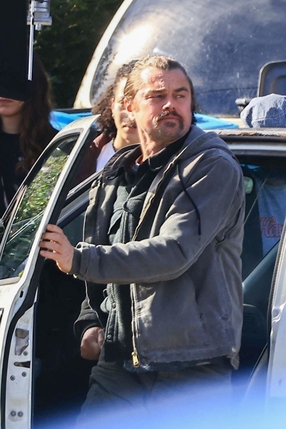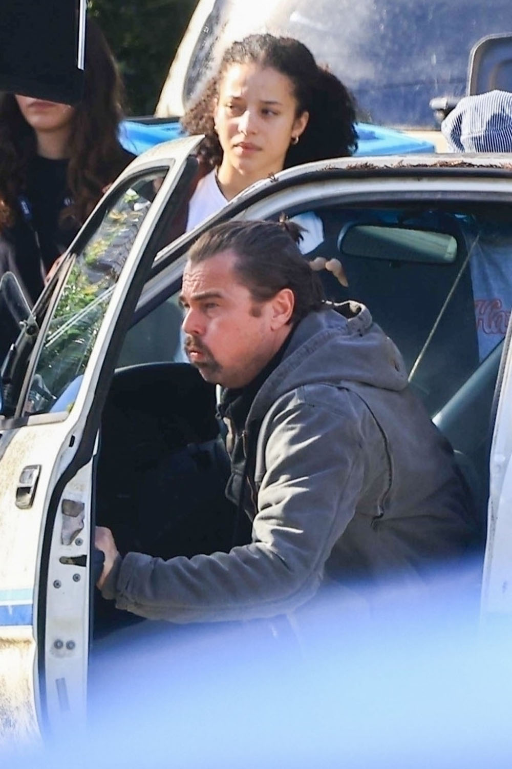 Filming for Paul Thomas Anderson’s new film is underway in Los Angeles, and this week Leonardo DiCaprio was seen on set rocking a man bun and regrettable facial hair. The film is referred to as “BC Project” and the plot is unknown, but from the facial hair, man bun, and sh-tty car he’s driving in character, we can deduce that Leo is playing a scummy guy.