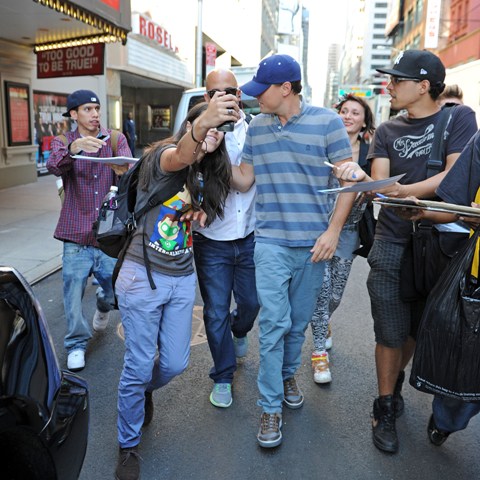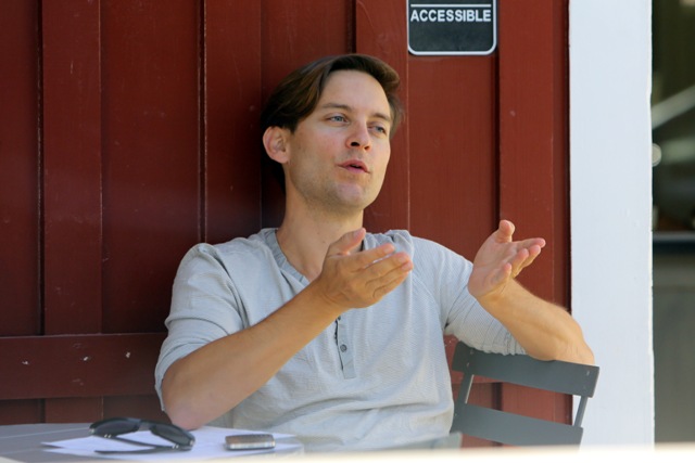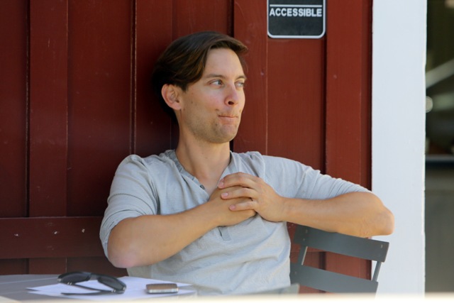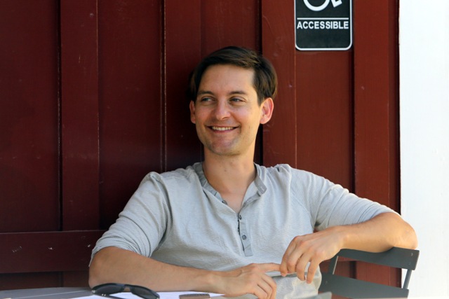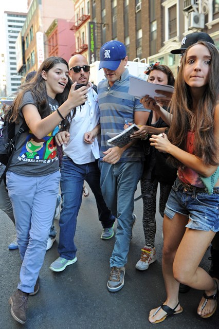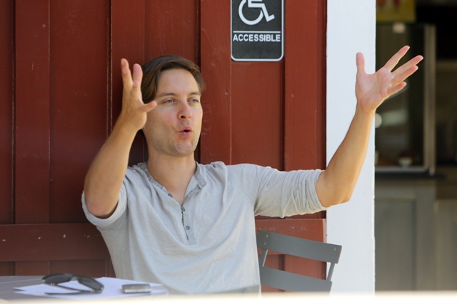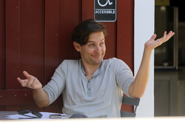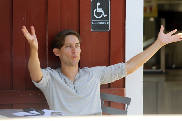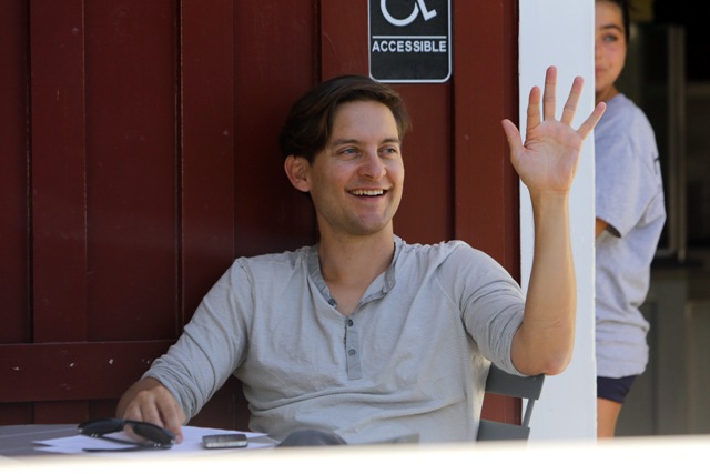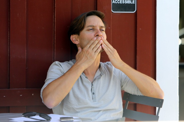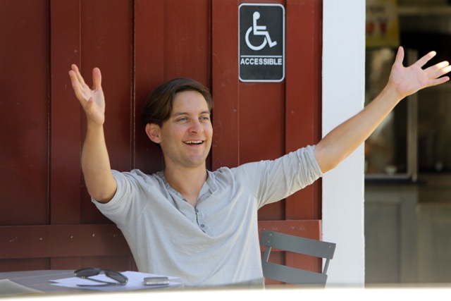 As Blake Lively works on Gossip Girl in New York, her boyfriend from her last birthday Leonardo DiCaprio is also there, also shooting, in a different part of the city. This is Leo on the set of The Wolf Of Wall Street getting swarmed by autograph seekers looking like he’d rather jump into a dumpster. Meanwhile over in LA, his best friend Tobey Maguire was being interviewed at a cafe. Tobey’s wife and daughter Ruby were there earlier, and when they drove by, as Ruby passed him in the car, Tobey opened his arms and shouted out I LOVE YOU!