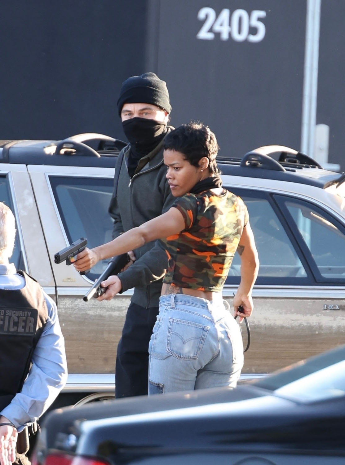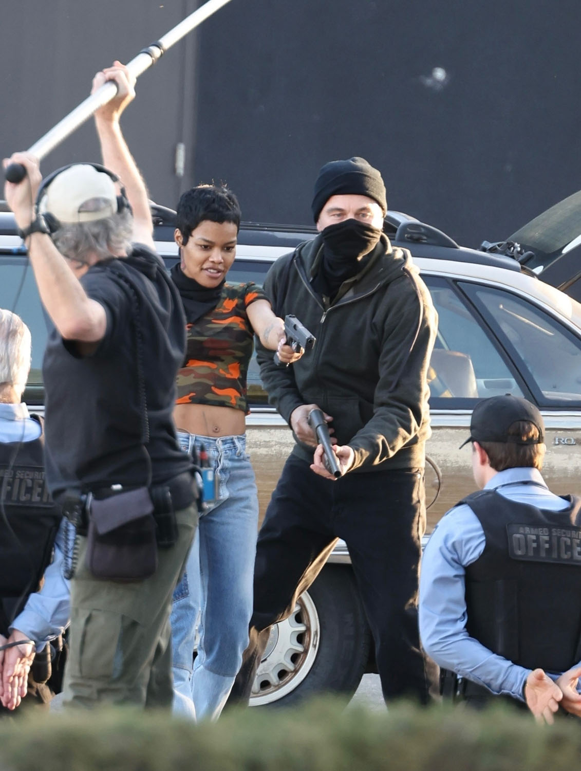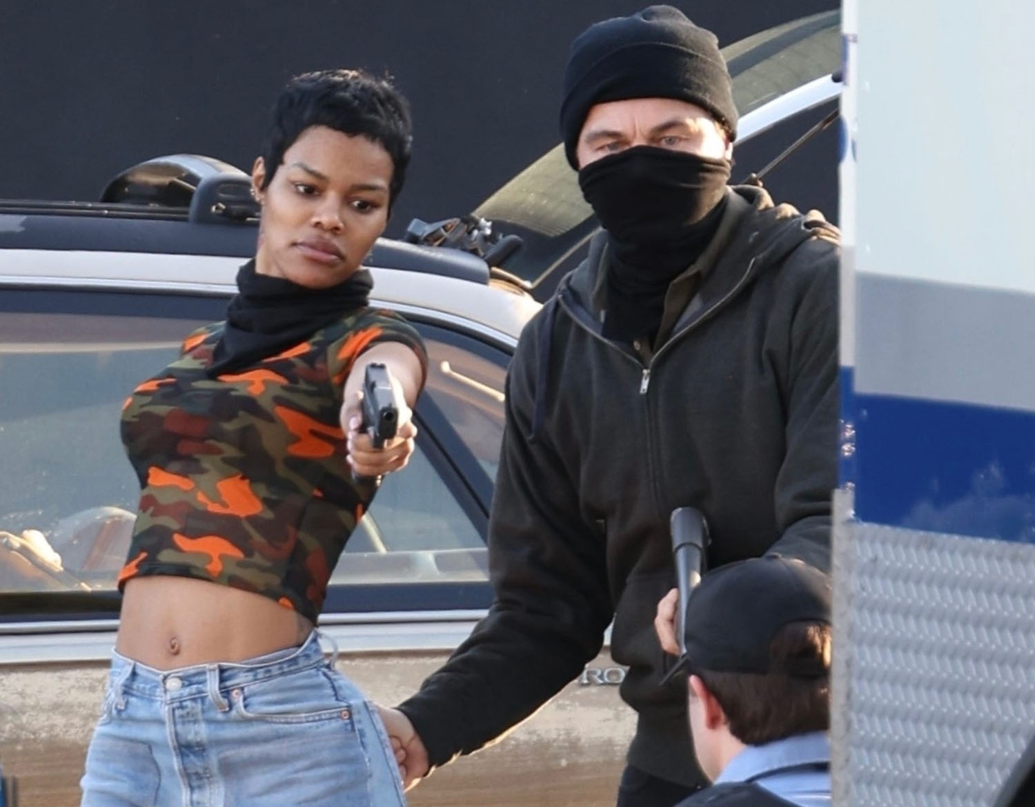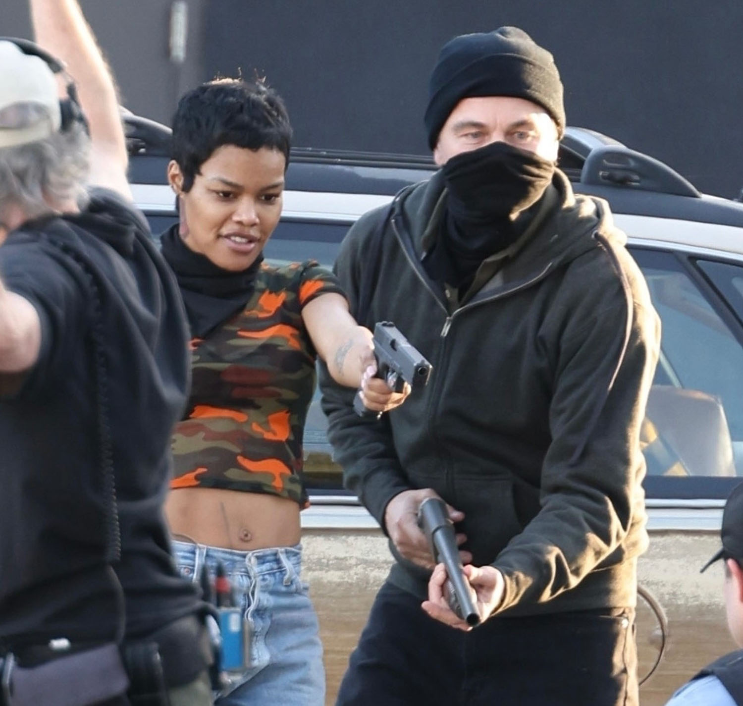 Here he is with Teyana filming a scene where they appear to be in the middle of a robbery and confronted by the cops. At one point, and this made me laugh, Leo apparently slaps Teyana on the ass suggesting that their characters are romantically linked. Or that his character would like to be romantically linked with hers. And now I’m so interested to see how that works on screen and whether or not I buy it.