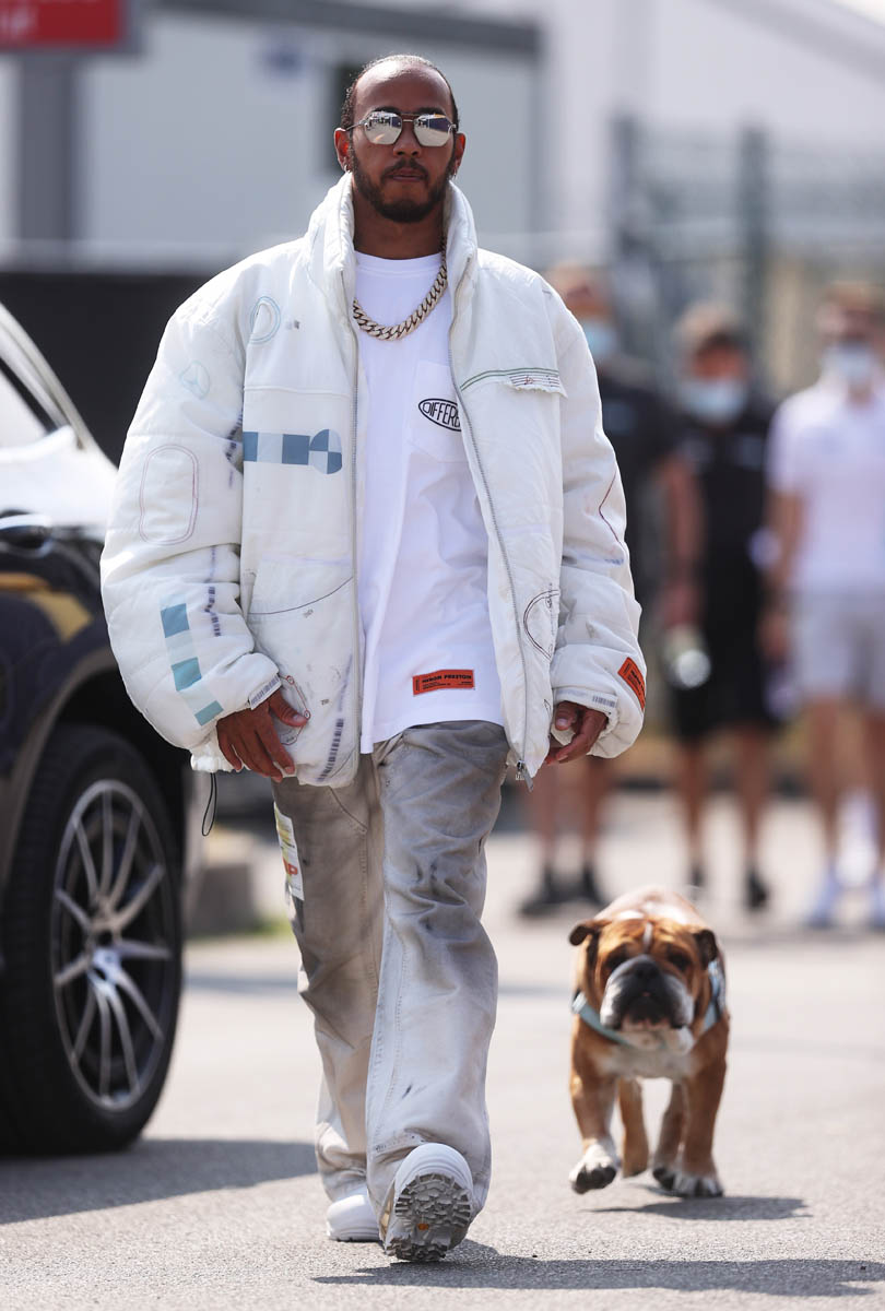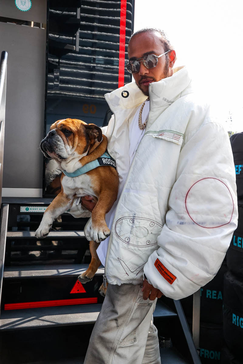 Here are some shots of Lewis from yesterday though, in a white puffer, doing some press before race weekend, joined by his usual companion, his bulldog Roscoe.