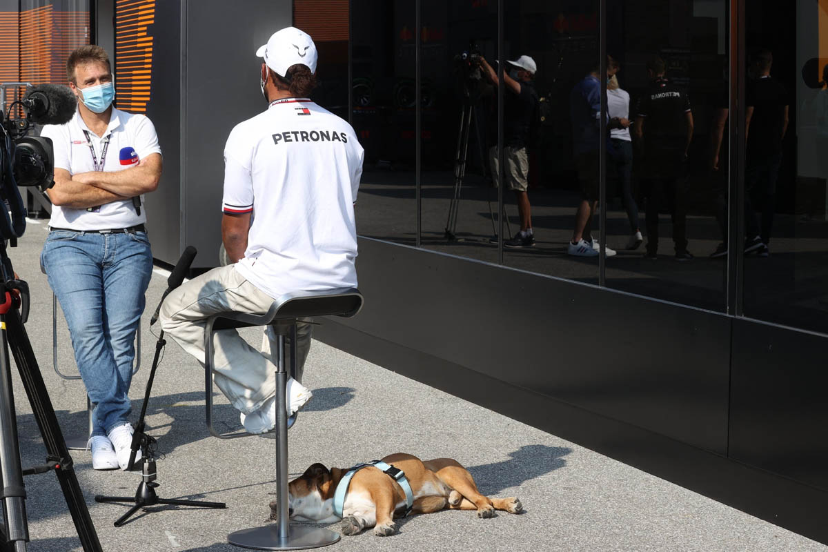 I love that this is Roscoe’s normal – being in a race environment, the cars everywhere, the tires everywhere, people rushing around on headsets, and Roscoe’s just part of that world too. It’s not unusual for anyone on the circuit to see Roscoe padding around the place. After all, his human is the sport’s biggest star. Roscoe, however, just might be the most pampered one though, even in F1, which is an expensive sport, a luxury sport.
