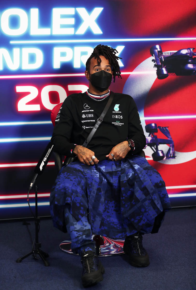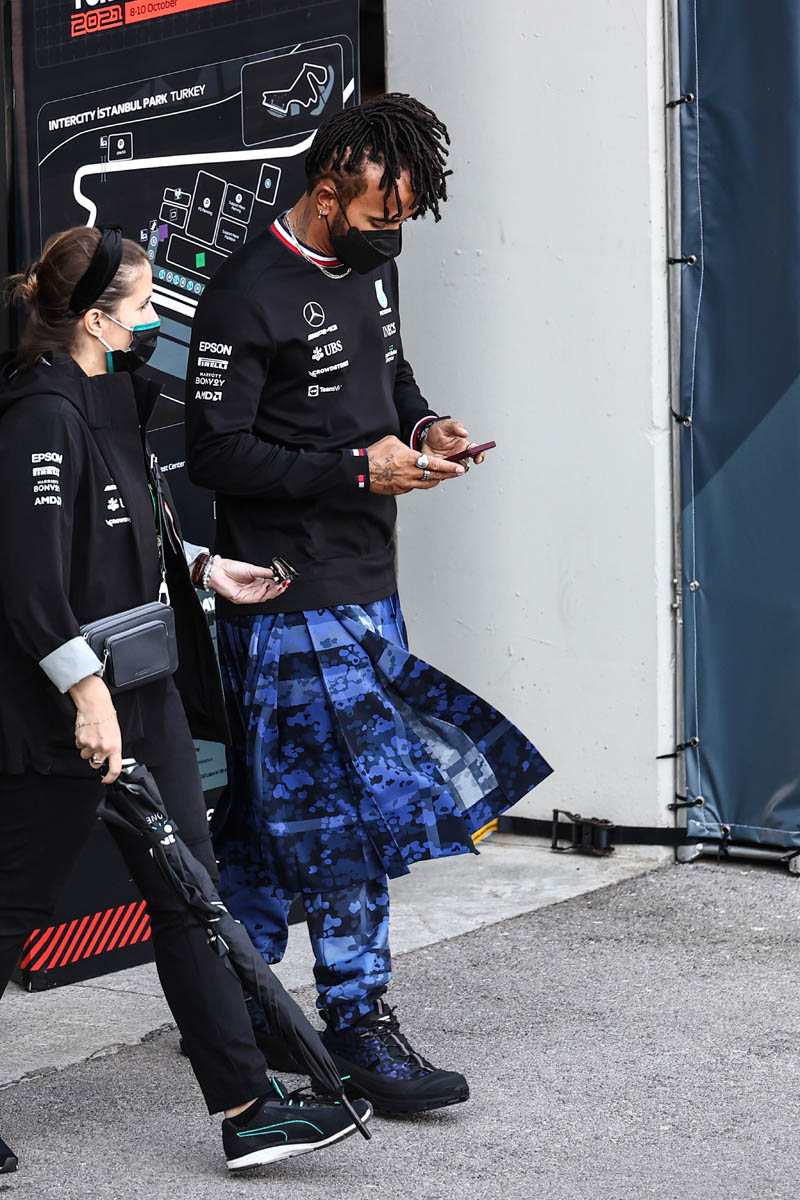The Turkish Grand Prix is on Sunday and it’s a tight race for the Driver’s Championship with Lewis Hamilton and Max Verstappen separated by just two points with just seven races to go in the season. The teams are now in Turkey prepping for the weekend but before practice and training starts, as we know, the track is Lewis’s runway. He reliably shows up on Thursday and Friday in OUTFITS.