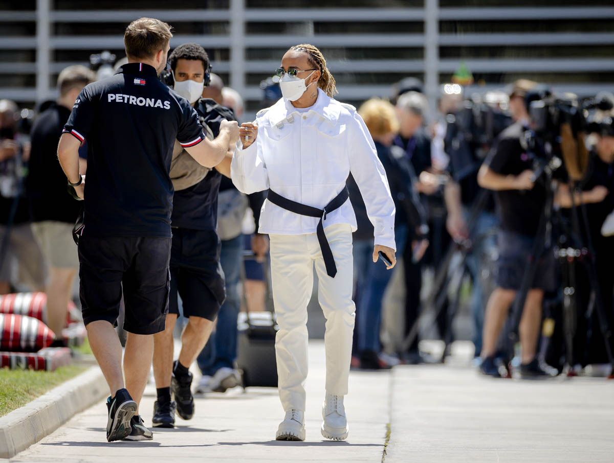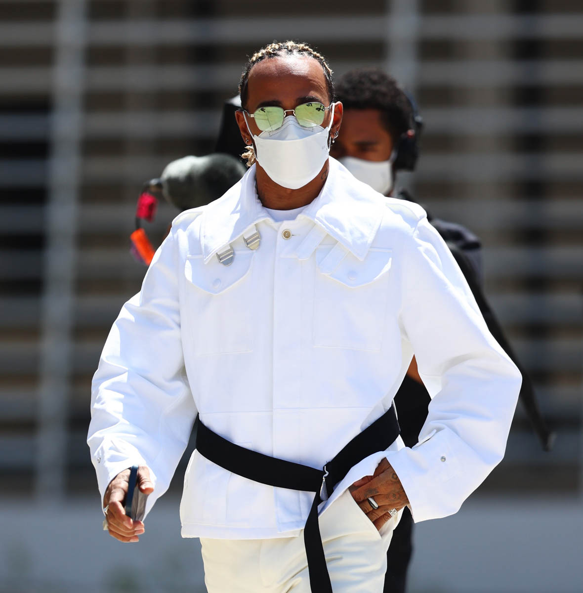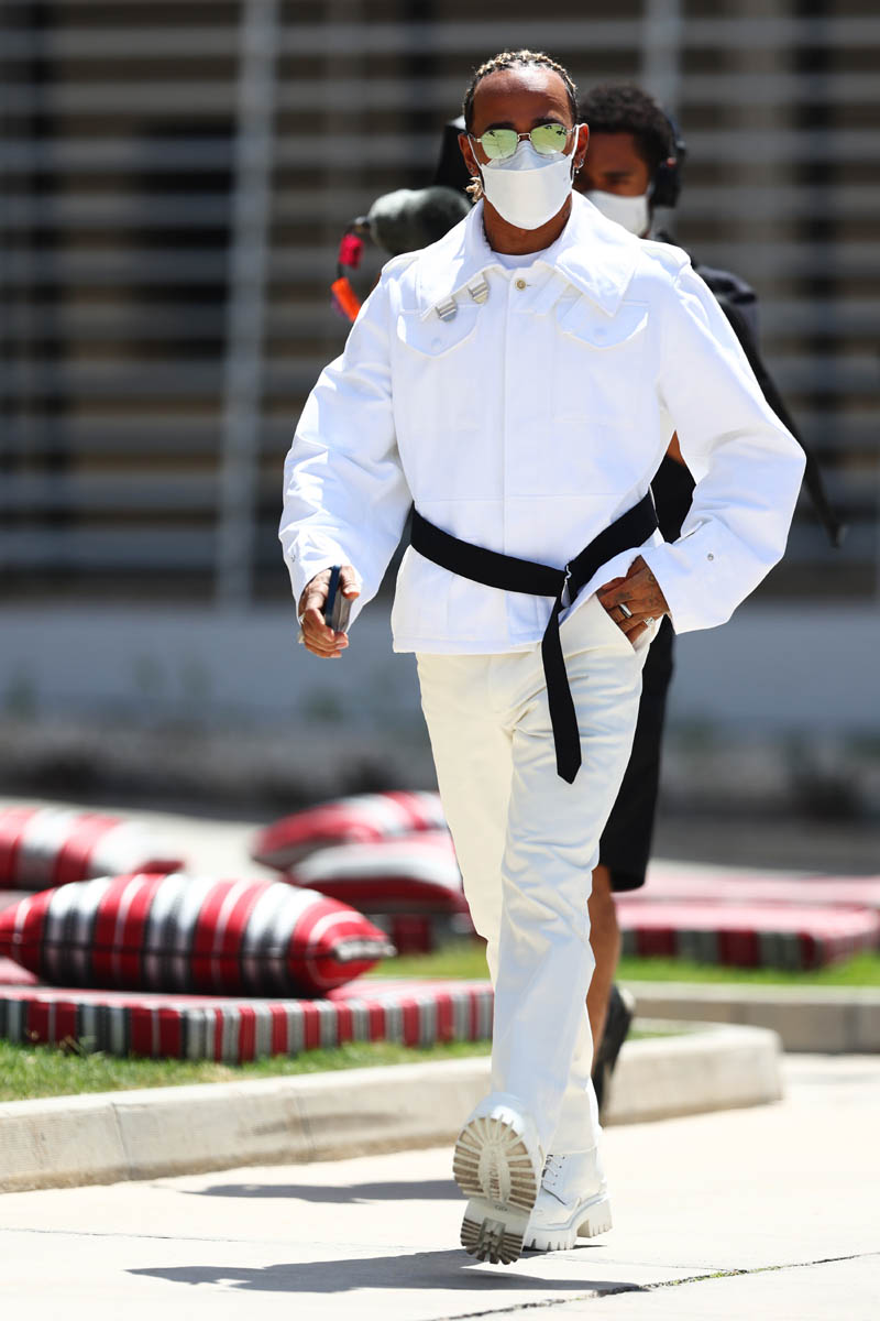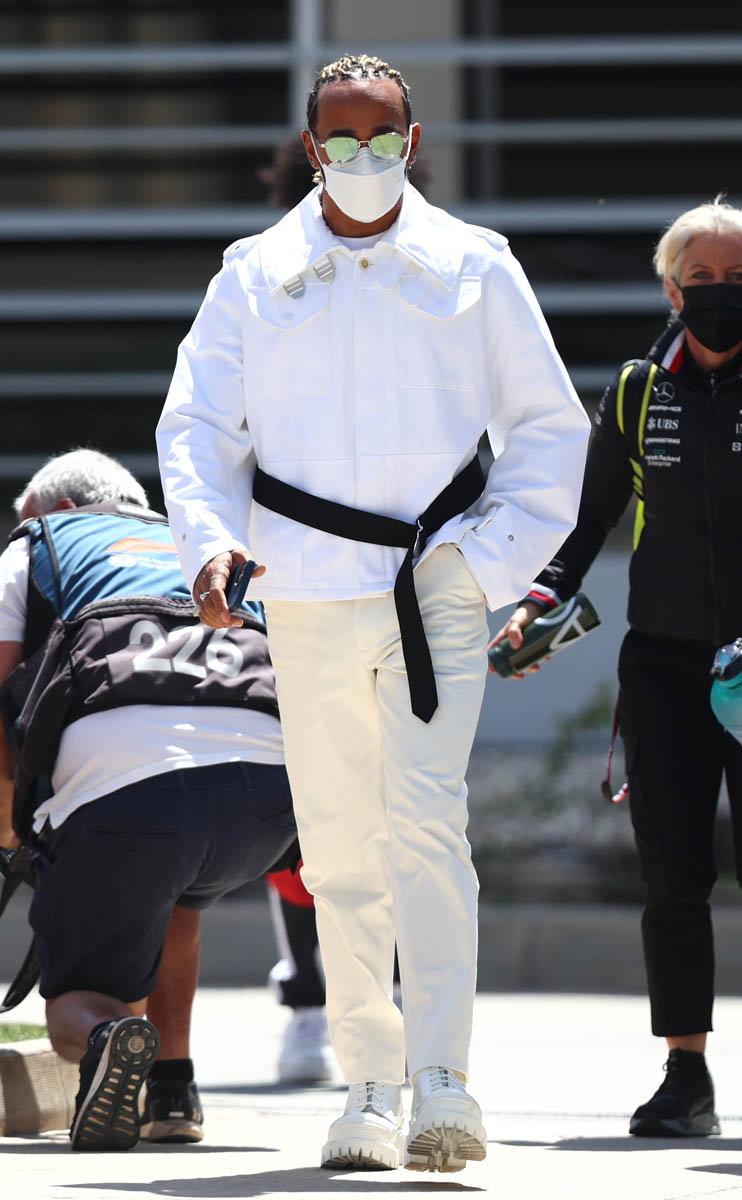 For practice today, Lewis chose white: a gorgeous structured jacket with a tie-belt over a pair of ecru pants. Also, he debuted his 2022 helmet: