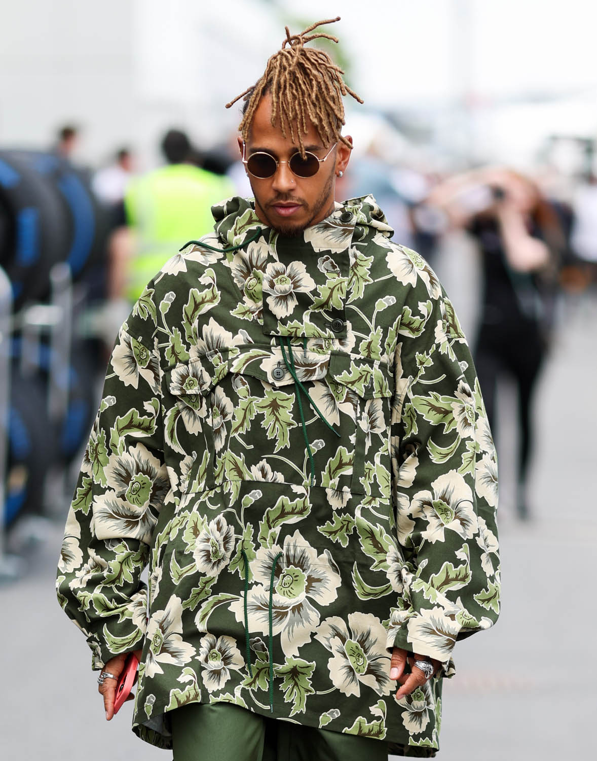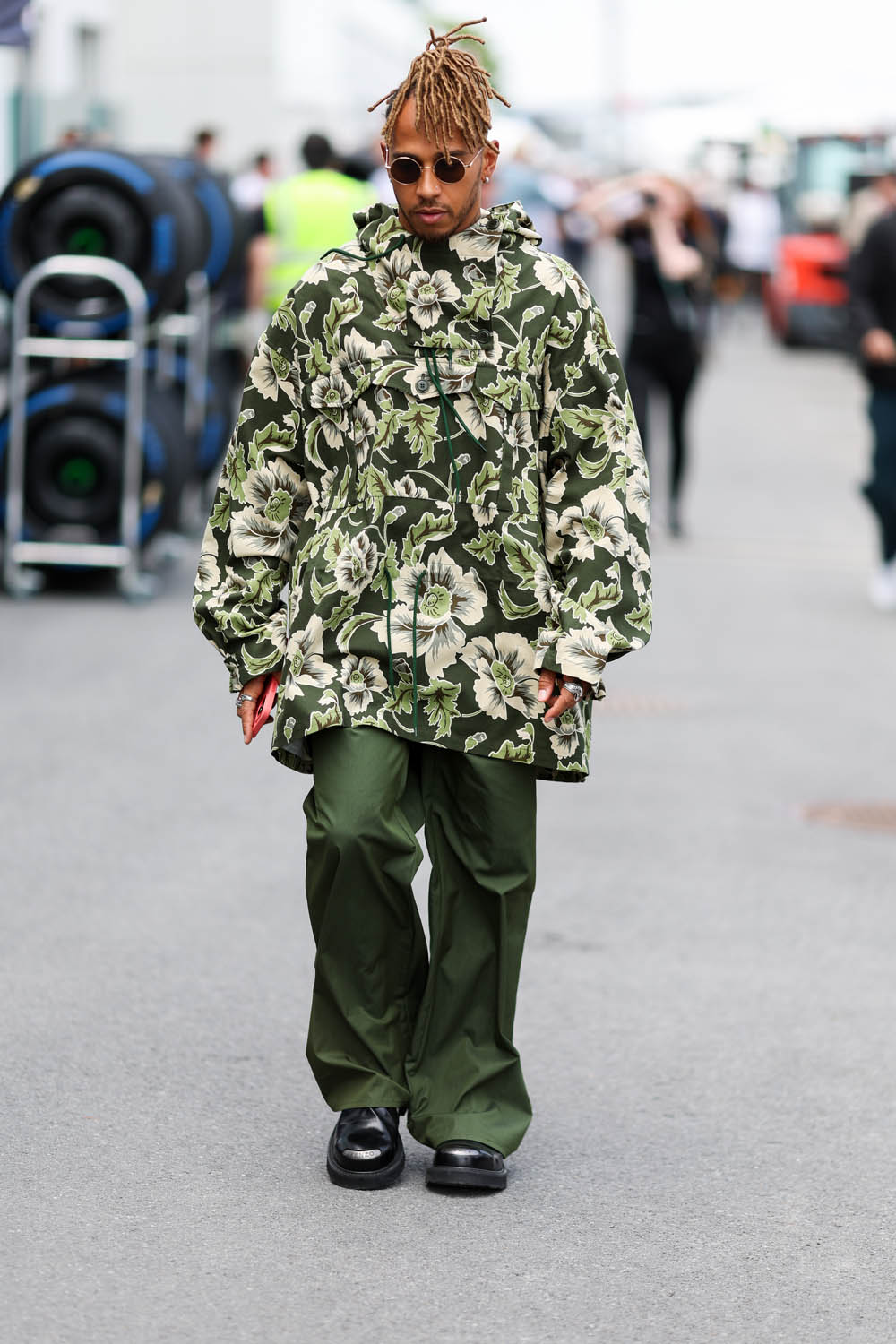 Speaking of Lewis off track though, since he loves Montreal so much, he brought big fashion energy to his Montreal runway. Here he is in olive green and oversize Kenzo: