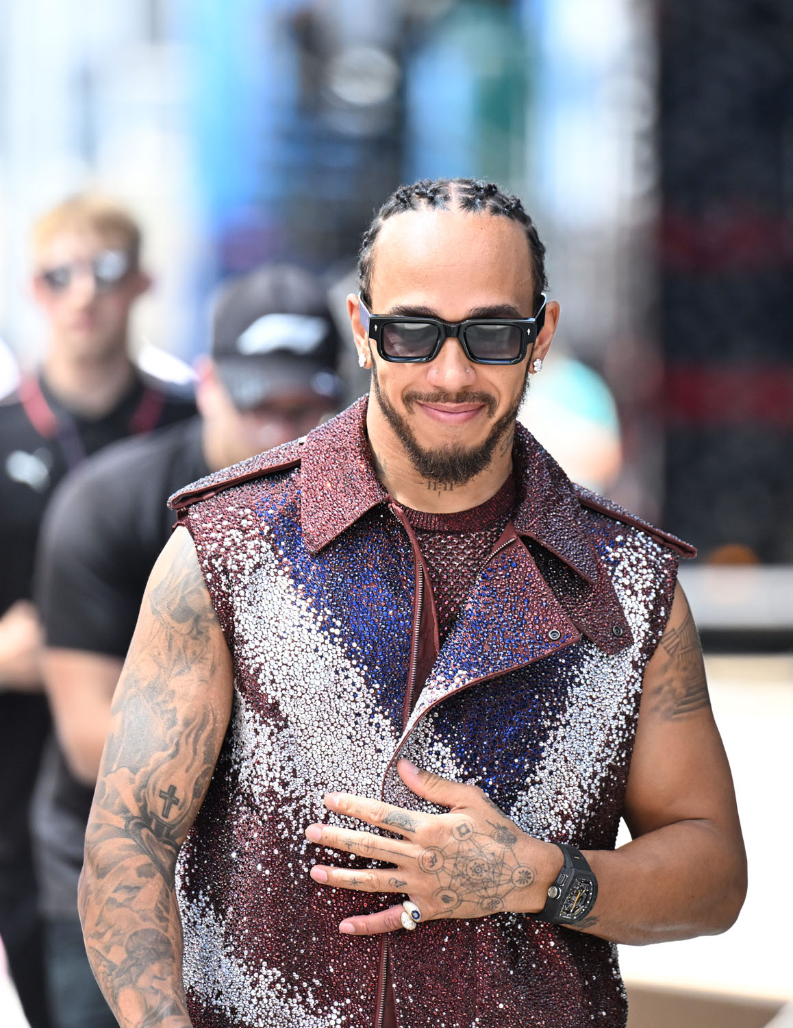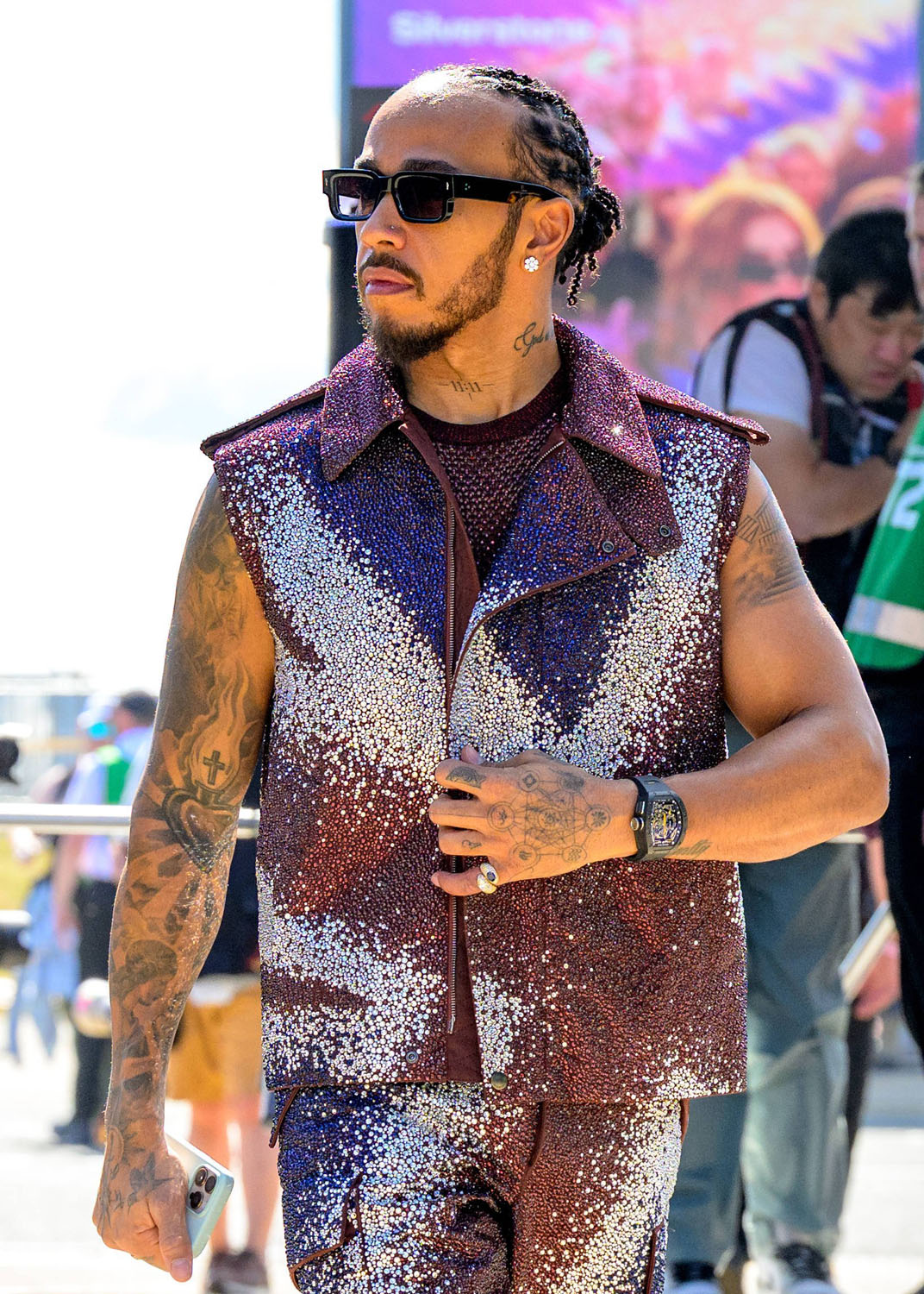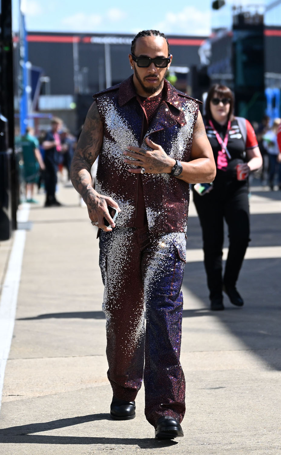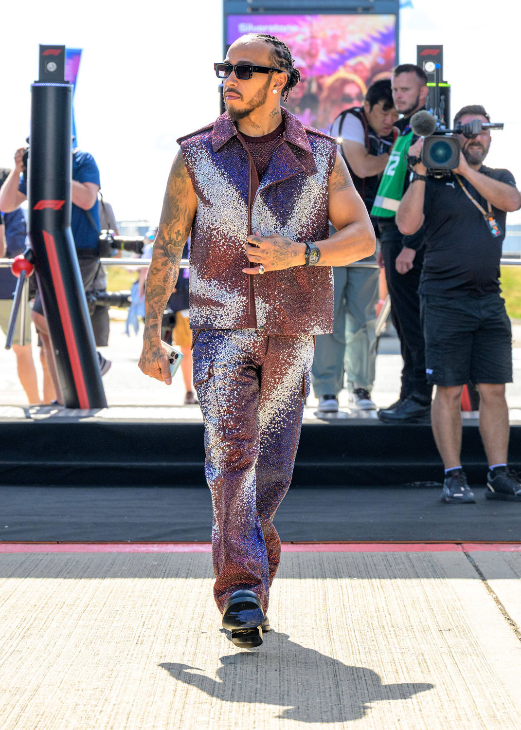 He was saving his one – custom Burberry, so a British brand on the British track, and it looks like a Union Jack, right? Look at the way it sparkles when he moves.