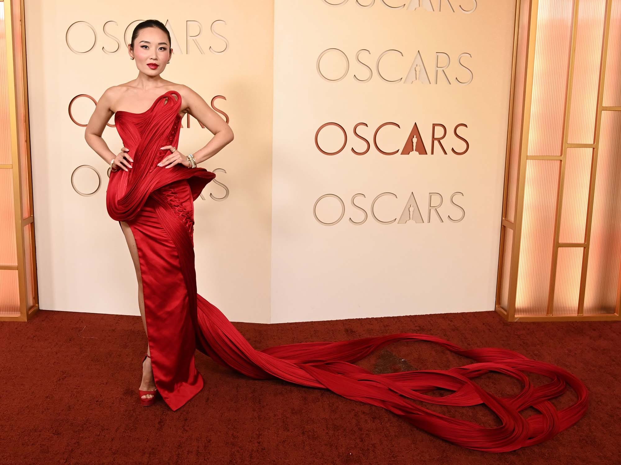 She’s so good at it because she has a background in dance. And that also serves her well on the red carpet, because she understands how to use her body to showcase the clothes. Li-Li was in a magnificent Gaurav Gupta, it’s even better in person. When she was at the glambot just a few feet below me, I could see how precisely constructed the dress was, how perfectly tailored, the smallest and most exquisite details in the sculpture and the shape. And that train. The train wasn’t just unusual – to me, the way I saw it, the train was symbolic.